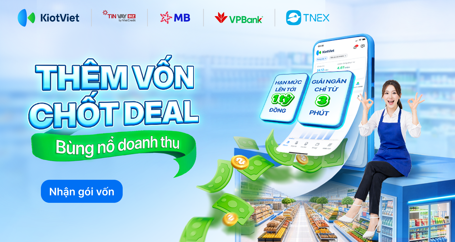 Trong bối cảnh thị trường biến động, việc sở hữu nguồn vốn lưu động dồi dào là yếu tố sống còn của mọi chủ shop. Tuy nhiên, rào cản về thủ tục ngân hàng phức tạp thường khiến các hộ kinh doanh bỏ lỡ thời cơ. Hiểu được điều đó, KiotViet mang đến giải pháp vay vốn tín chấp ngay trên ứng dụng, giúp doanh nghiệp "nhập hàng đúng lúc - chi lương đúng hẹn - hợp đồng liên tục về tay".