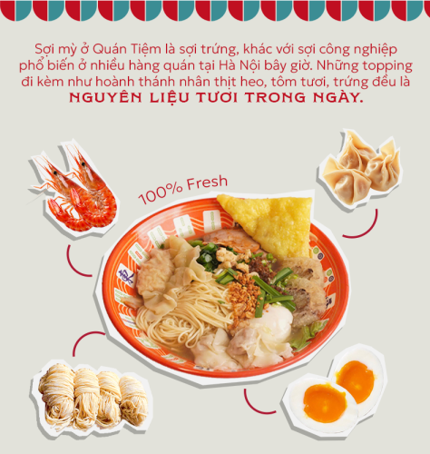 Ngoài ra trong bát mỳ tại Tiệm Quán, những topping đi kèm như hoành thánh nhân thịt heo, tôm tươi, trứng đều là nguyên liệu tươi trong ngày. Anh không nhập nhiều theo kiểu dự trữ mà chỉ nhập số lượng vừa đủ để mình dễ kiểm soát, hết là thôi không bán nữa.