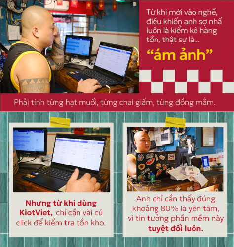 Nhưng tính năng mà anh cảm thấy tâm đắc nhất là kiểm kê tồn kho. Từ khi mới vào nghề, điều khiến anh sợ nhất luôn là kiểm kê hàng tồn, thật sự là… ám ảnh. Phải tính từng hạt muối, từng chai giấm, từng đồng mắm. Mỗi lần đến kỳ kiểm kê cuối tháng là anh chỉ muốn ốm đúng hôm đó để né (cười).