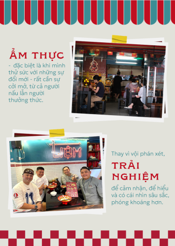 Với anh, ẩm thực - đặc biệt là khi mình thử sức với những sự đổi mới - rất cần sự cởi mở, cả từ người nấu lẫn người thưởng thức. Thay vì vội phán xét, hãy trải nghiệm để cảm nhận, để hiểu và có cái nhìn sâu sắc, phóng khoáng hơn.