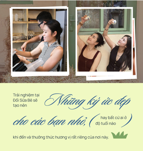 Mình từng đọc được rằng: những ký ức tuổi thơ đẹp như chiếc gối êm, như điểm tựa cho mình khi trưởng thành. Vậy nên mình mong rằng, trải nghiệm tại Đồi Sữa Bê sẽ tạo nên những ký ức đẹp cho các bạn nhỏ hay bất cứ ai ở độ tuổi nào khi đến và thưởng thức hương vị rất riêng của nơi này. Bản thân mình cũng cảm thấy rất hạnh phúc khi mình đang mang đến nhiều niềm vui nho nhỏ cho những khách hàng yêu mến Đồi Sữa Bê: từ các cặp đôi yêu đương cho đến gia đình nhỏ, từ các bạn trẻ đi cùng bố mẹ đến các gia đình 3 thế hệ. Mong rằng những giây phút tại Đồi Sữa Bê sẽ là những kỷ niệm đẹp, đáng nhớ cho tất cả mọi người.