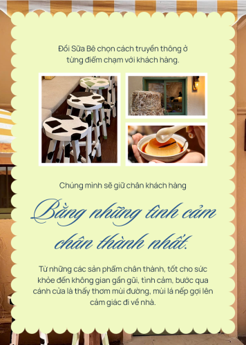 Với một thương hiệu truyền thống, Đồi Sữa Bê chọn cách truyền thông ở từng điểm chạm với khách hàng. Khi khách hàng đến đây, chúng mình sẽ giữ chân khách hàng bằng những tình cảm chân thành nhất. Từ những cái sản phẩm chân thành, tốt cho sức khỏe đến không gian gần gũi, tình cảm, bước qua cánh cửa là thấy thơm mùi đường, mùi lá nếp gợi lên cảm giác đi về nhà. Mình nghĩ rằng những điều đi từ trái tim sẽ đi đến trái tim. Đồi Sữa Bê đang may mắn đón nhận sự quan tâm từ mọi người và mình cảm thấy rất trân trọng, biết ơn về tình cảm của các “dân Đồi”.