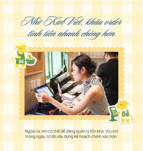 Tuy nhiên khi sử dụng KiotViet thì Đồi Sữa Bê vận hành mượt mà hơn hẳn. Nhờ KiotViet, khâu order - tính tiền nhanh chóng hơn. Ngoài ra, mình có thể dễ dàng quản lý tồn kho, thu chi trong ngày, từ đó xây dựng kế hoạch chính xác hơn.