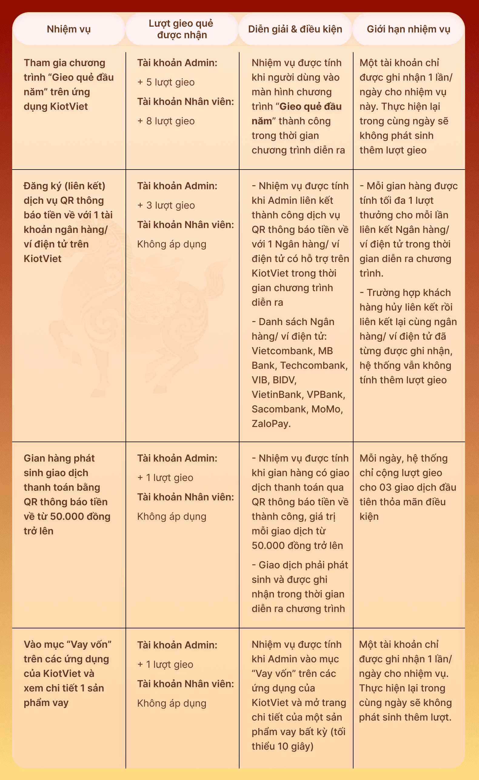 - Trong Thời gian chương trình, Khách hàng thực hiện một trong các nhiệm vụ tại bảng dưới đây. Với mỗi nhiệm vụ khi hoàn thành hợp lệ, hệ thống sẽ cộng lượt gieo quẻ mở quà tương ứng.