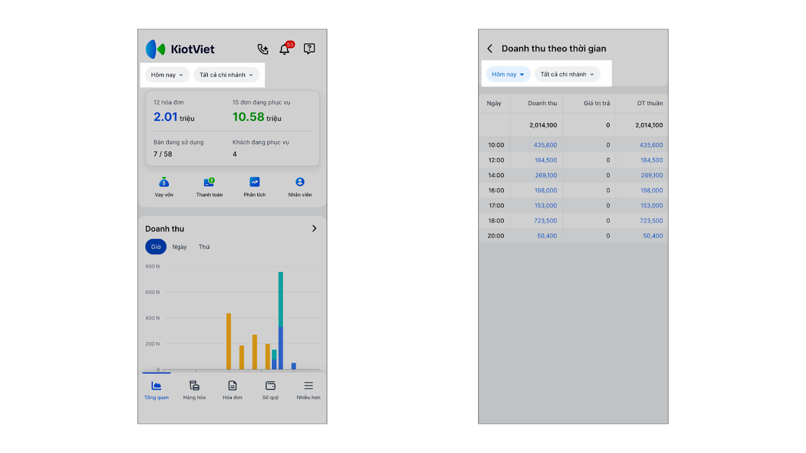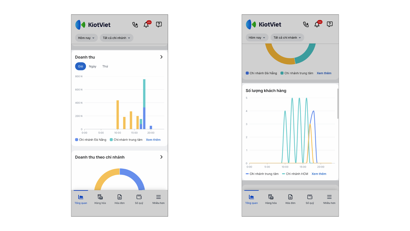 - Tình huống: Tương tự như trên Web, bạn có thể xem các biểu đồ thống kê theo giờ, ngày, thứ và theo chi nhánh (nếu có nhiều chi nhánh) ngay trên điện thoại.