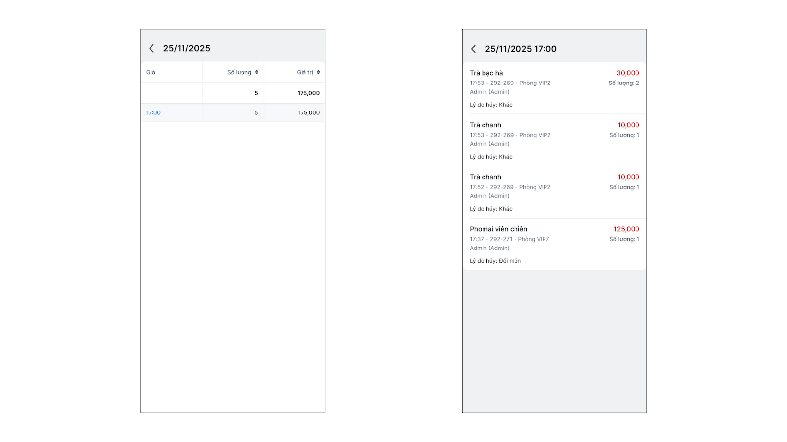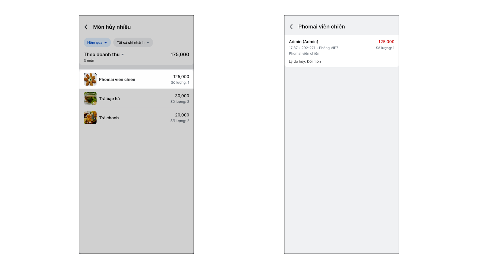 - Với danh sách Món hủy nhiều, bạn có thể chạm vào từng món cụ thể để xem chi tiết thời gian và nhân viên đã thực hiện thao tác hủy.