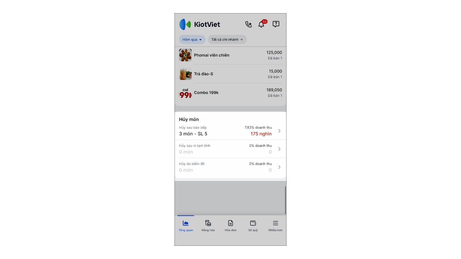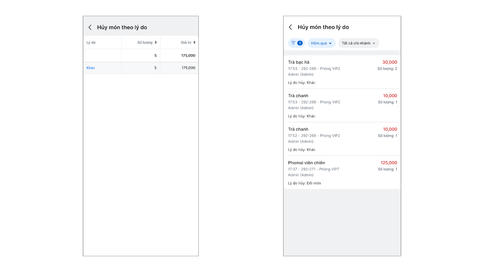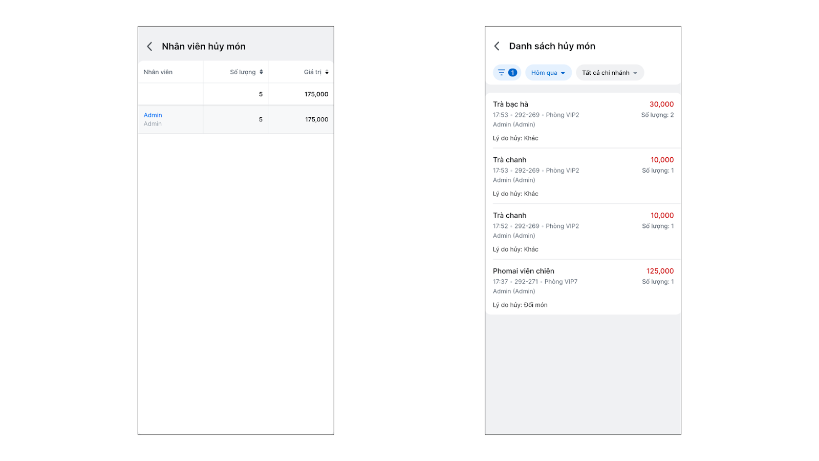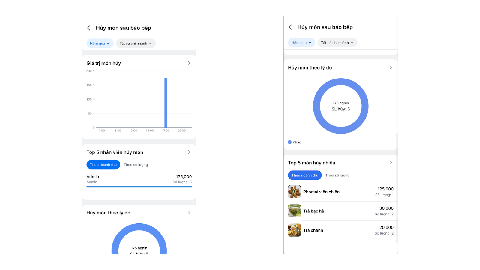 - Chạm để xem biểu đồ thể hiện Giá trị món hủy, top 5 nhân viên hủy món, Lý do hủy, top 5 món hủy nhiều.