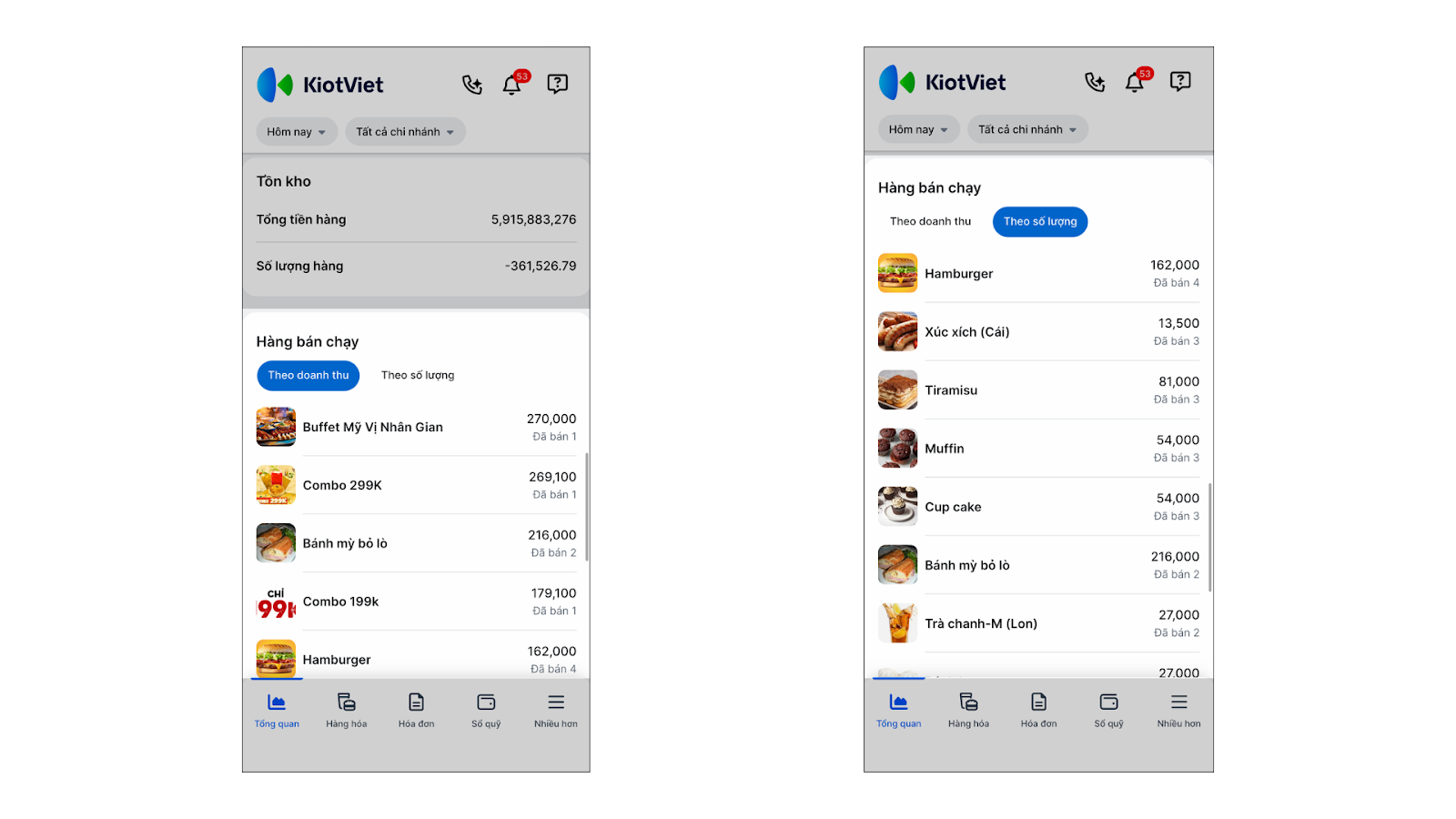 - Mục Top 10 hàng bán chạy cho phép bạn chạm để thay đổi kiểu xem theo số lượng hoặc theo doanh thu.