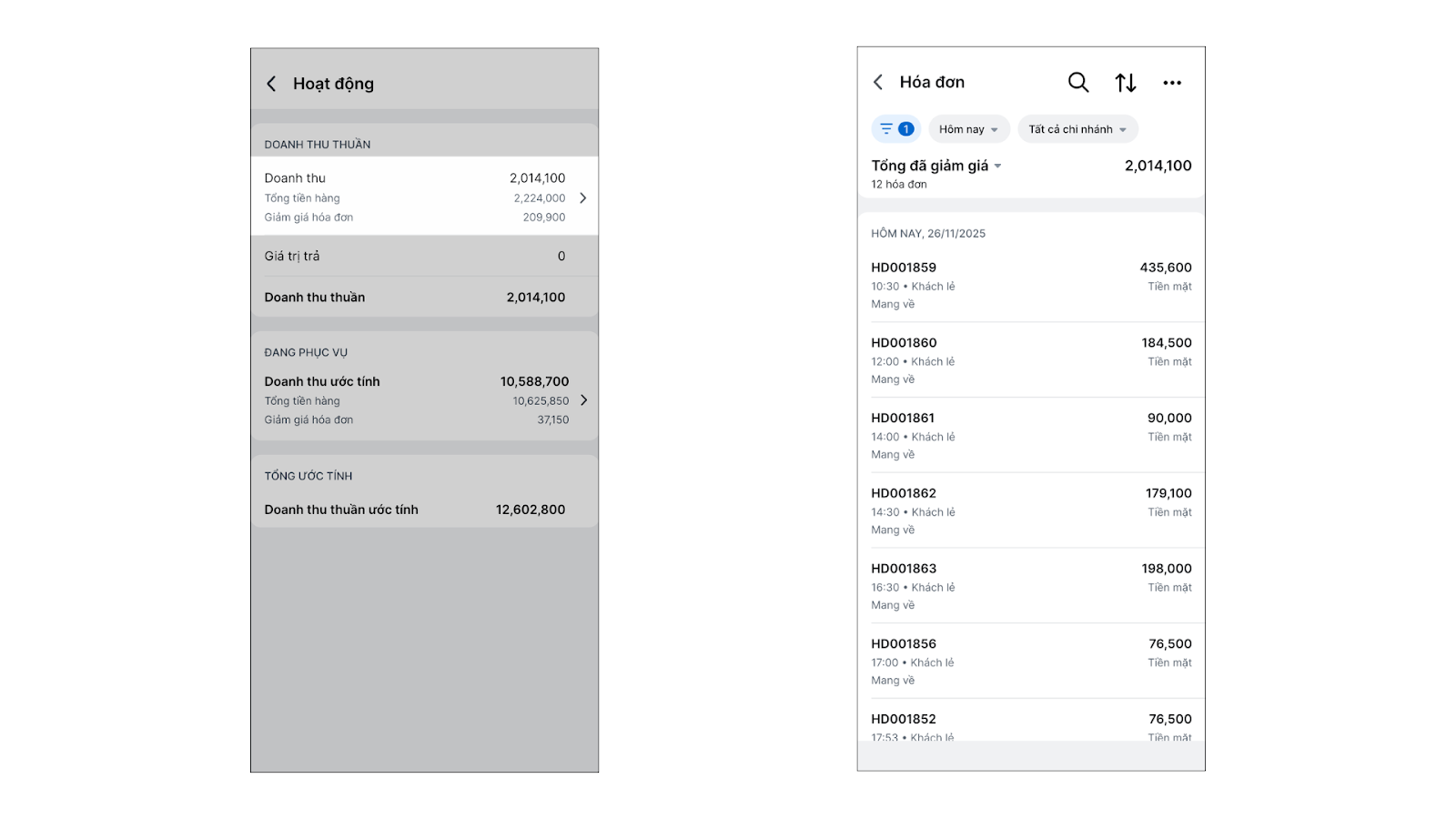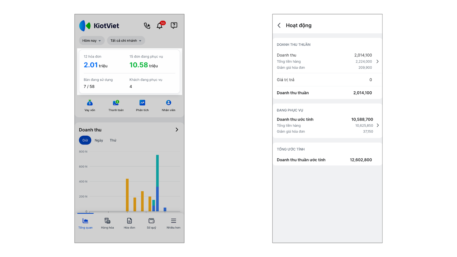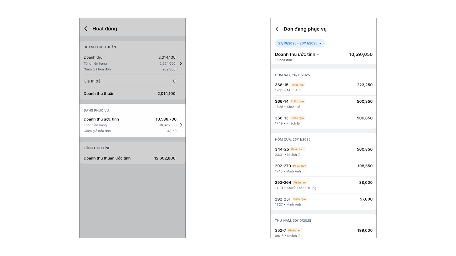 - Doanh thu tạm tính: Từ các đơn đang phục vụ.