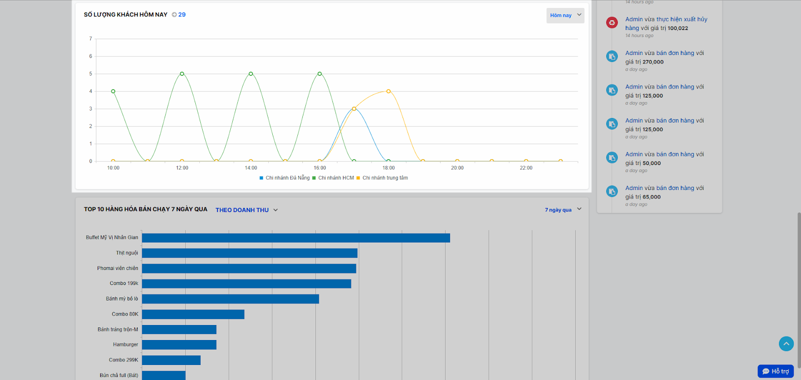 - Phía dưới bên phải: Thể hiện thông báo về sinh nhật của khách hàng và các hoạt động gần đây của người dùng trên hệ thống.