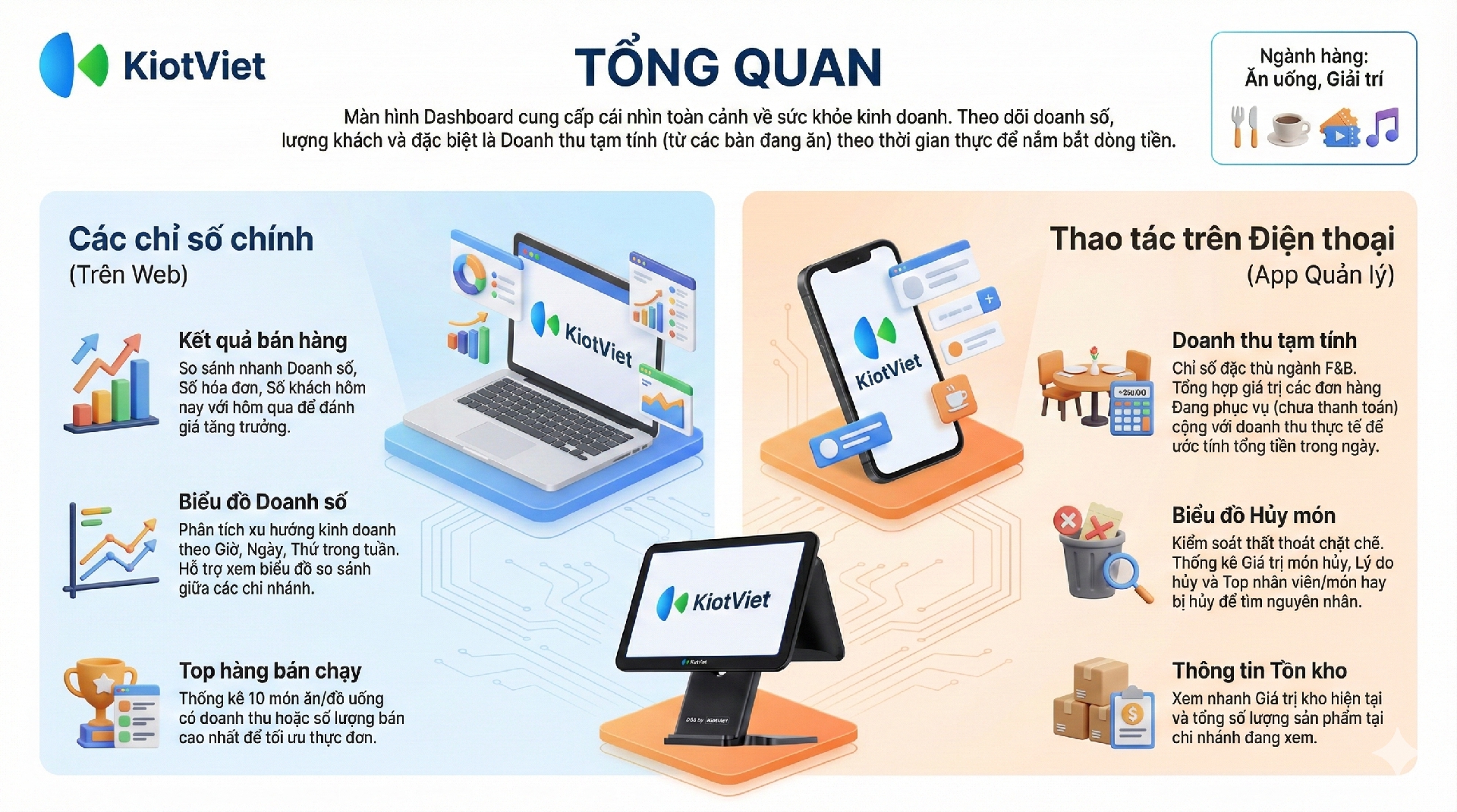 Màn hình Tổng quan cung cấp cho bạn cái nhìn khái quát nhất về tình hình hoạt động kinh doanh của nhà hàng, quán ăn. Bạn có thể nhanh chóng theo dõi các số liệu thống kê, doanh thu (bao gồm cả doanh thu tạm tính từ các bàn đang phục vụ), và các hoạt động phát sinh trong ngày.