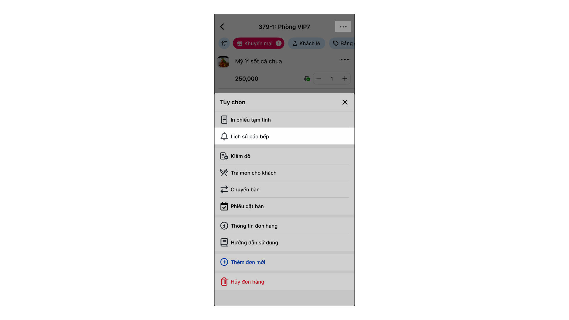 - Trên màn hình chi tiết đơn hàng → bạn nhấn 3 chấm → chọn Lịch sử báo bếp.