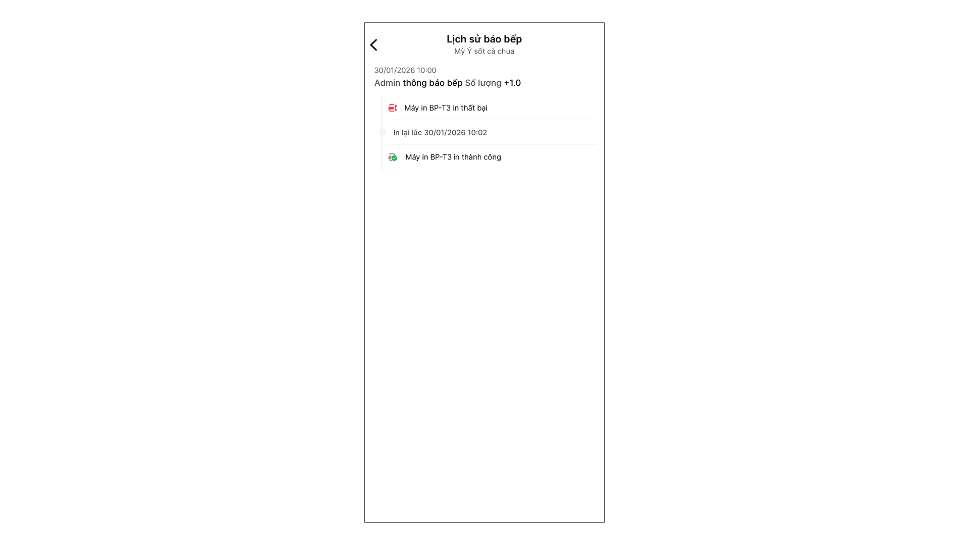 - Bạn nhấn vào từng món để xem lịch sử in chi tiết.