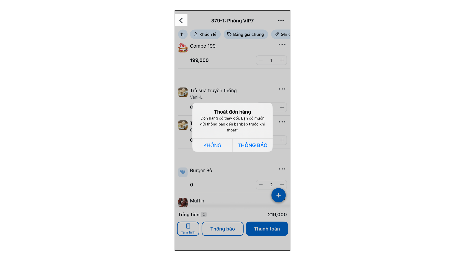 - Tình huống: Bạn cập nhật số lượng món trên ứng dụng nhưng chưa nhấn Thông báo gửi thông tin tới bếp.