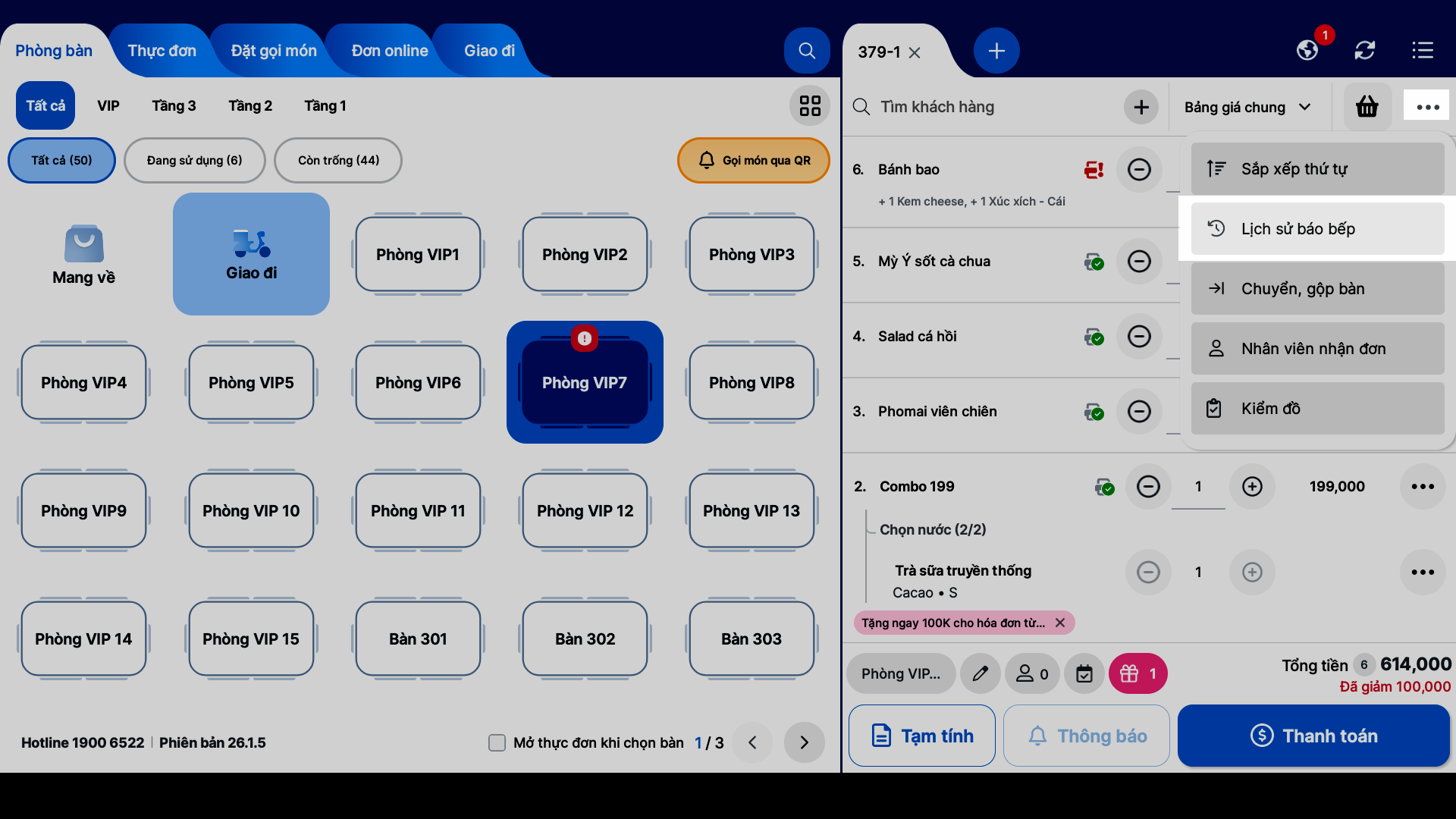 - Tại màn hình Thu ngân, bạn nhấn vào biểu tượng 3 chấm → chọn Lịch sử báo bếp.