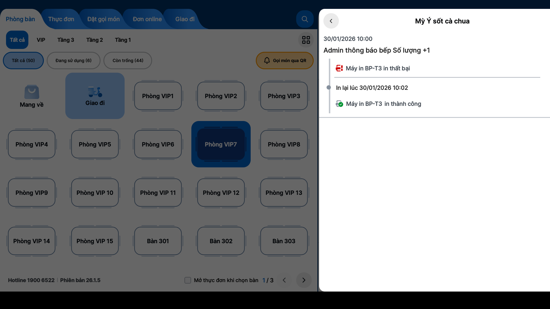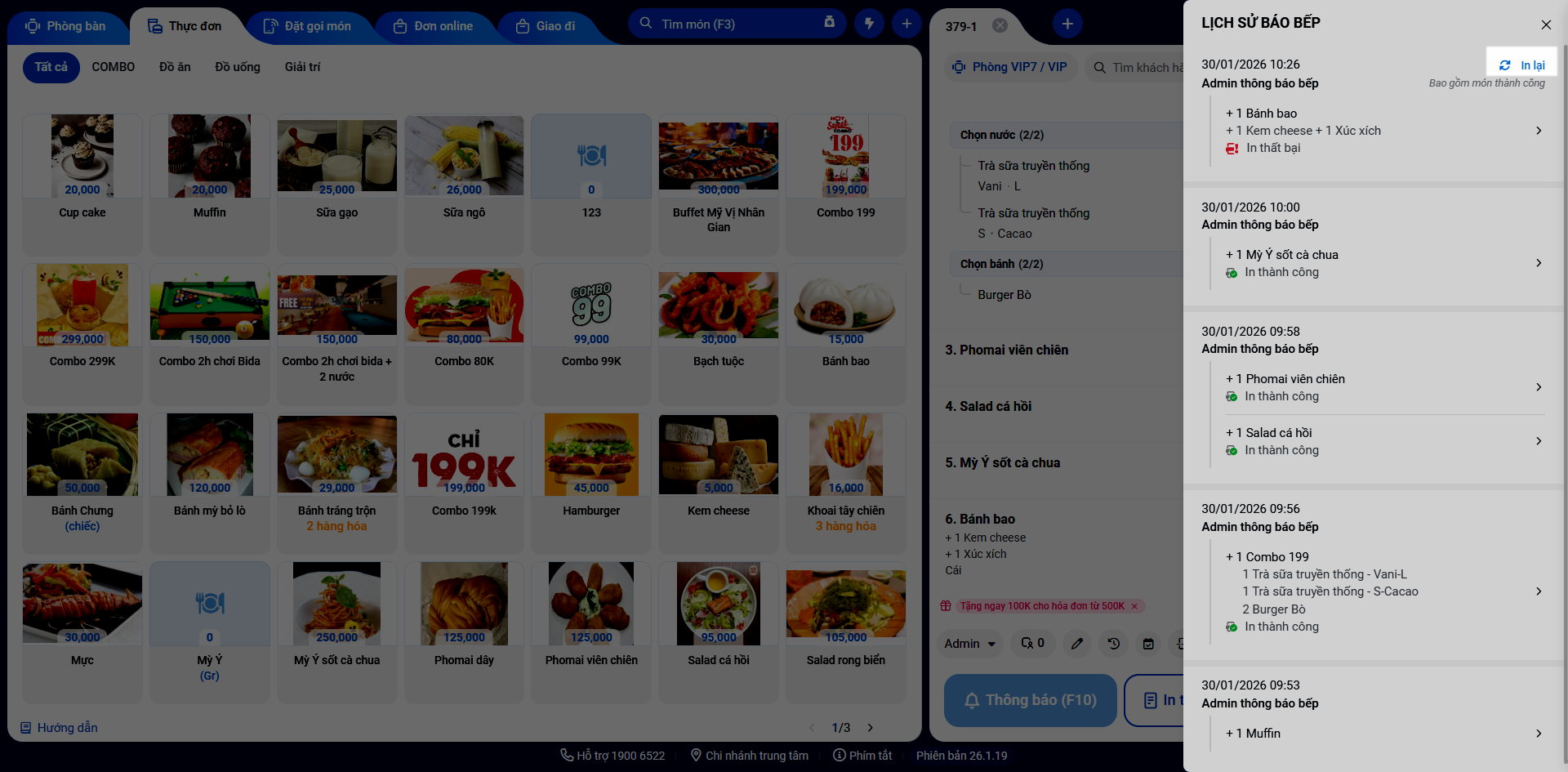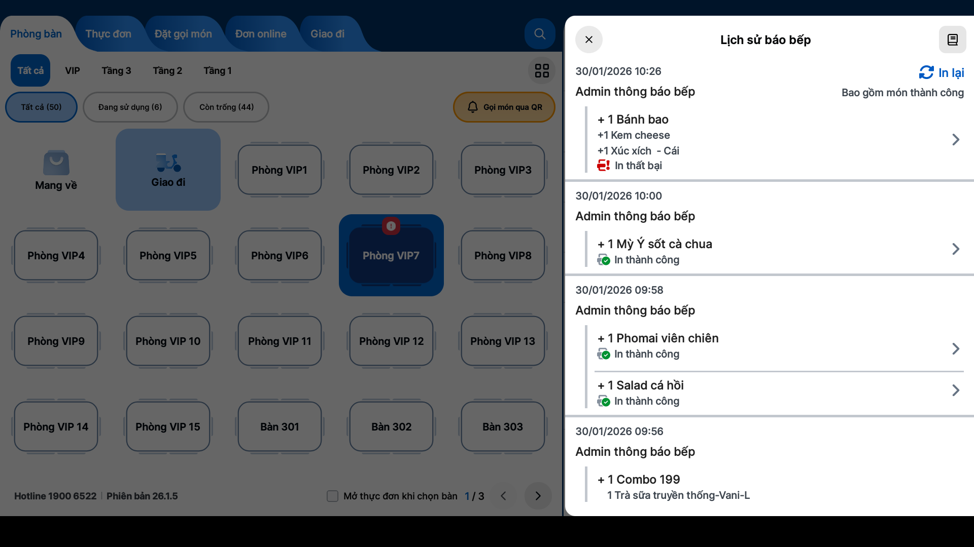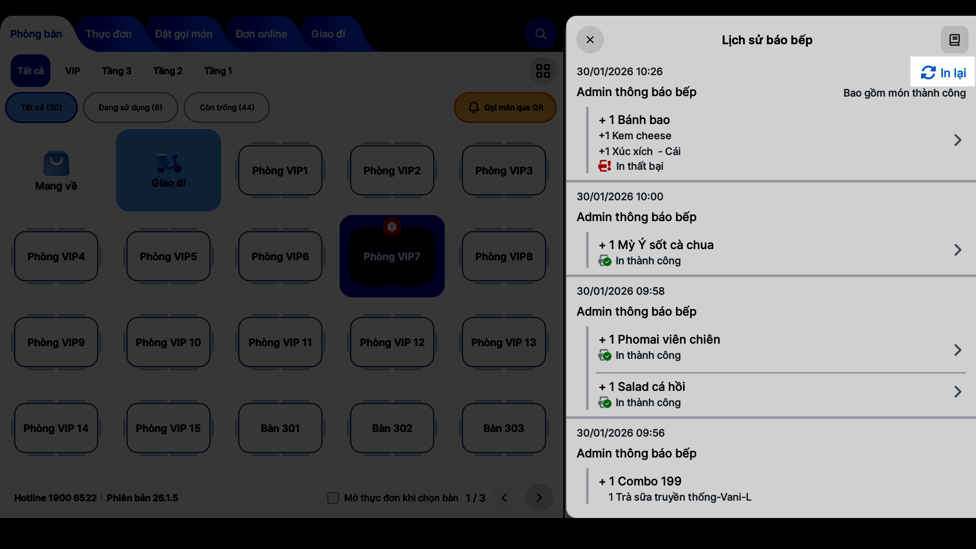 - Tình huống: Bạn thực hiện đối soát các lệnh báo bếp đã gửi ngay trên máy POS để kiểm tra tình trạng in ấn, đảm bảo không có món nào bị sót do lỗi kỹ thuật và phản hồi chính xác tiến độ cho khách hàng.