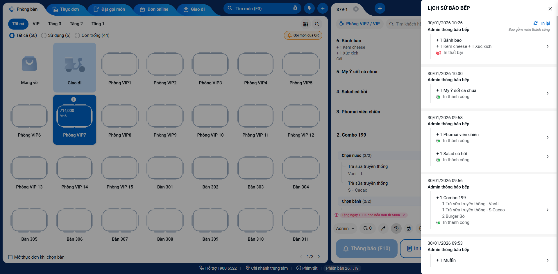 Lưu ý: Hệ thống cũng hiển thị thông tin lỗi in chế biến khi bạn nhấn chọn Lịch sử báo bếp