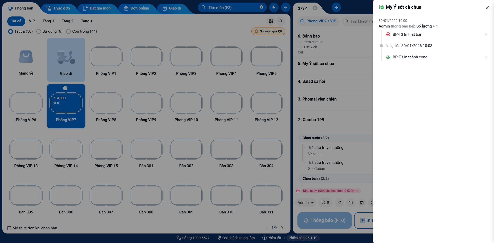 - Ngay khi có lỗi in, hệ thống sẽ hiển thị popup thông báo và hiện số lệnh in lỗi trên biểu tượng lỗi in chế biến và trên món có lỗi in.