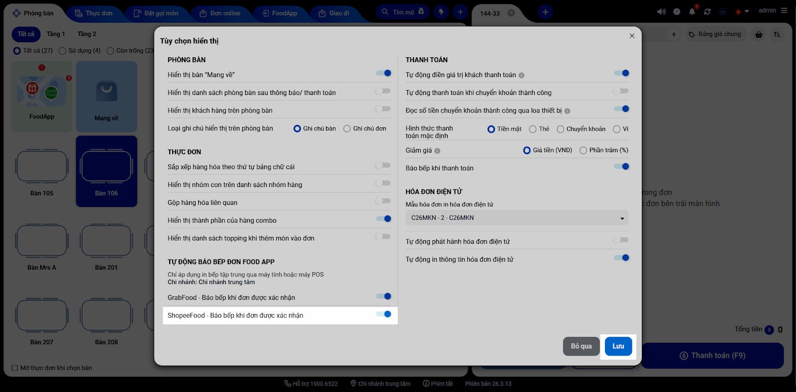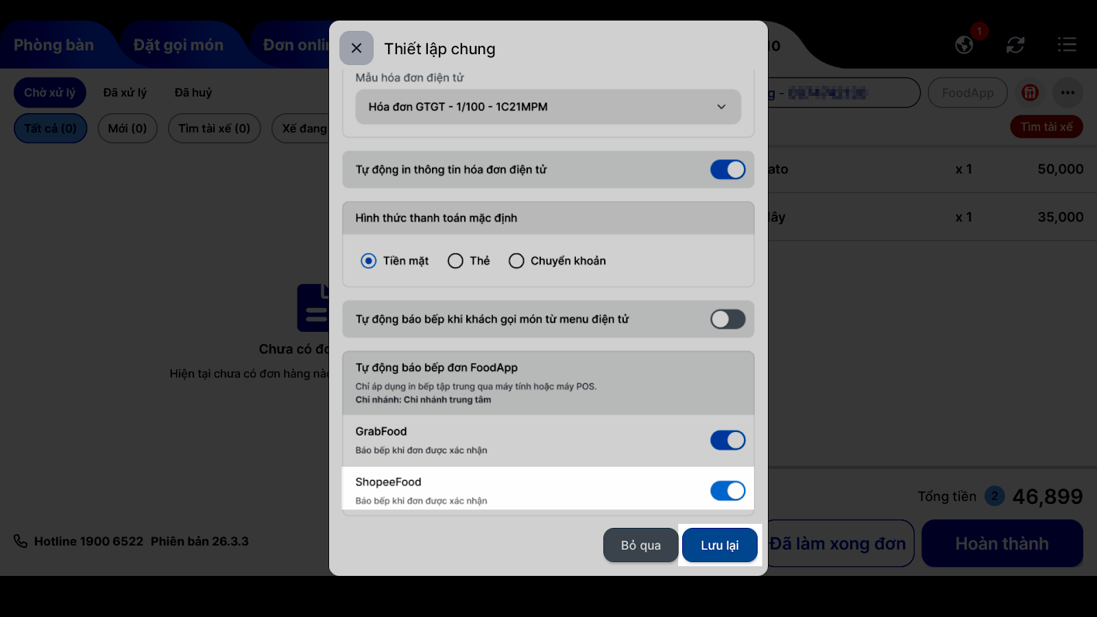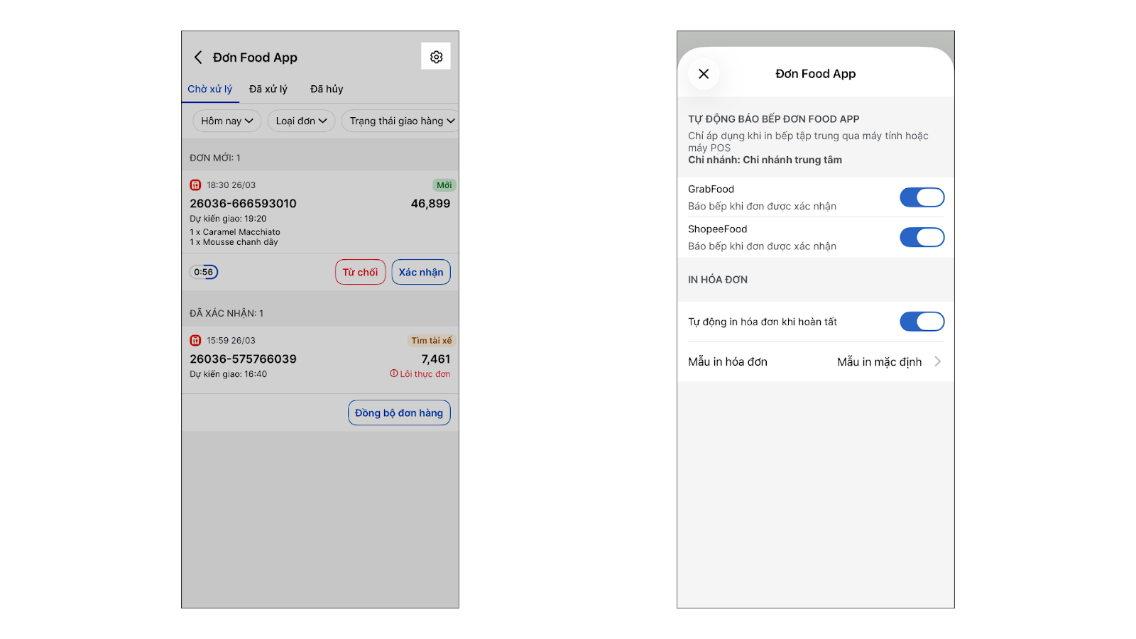 - Tự động báo bếp khi đơn được xác nhận (Chỉ áp dụng khi in bếp tập trung qua máy tính hoặc máy POS).