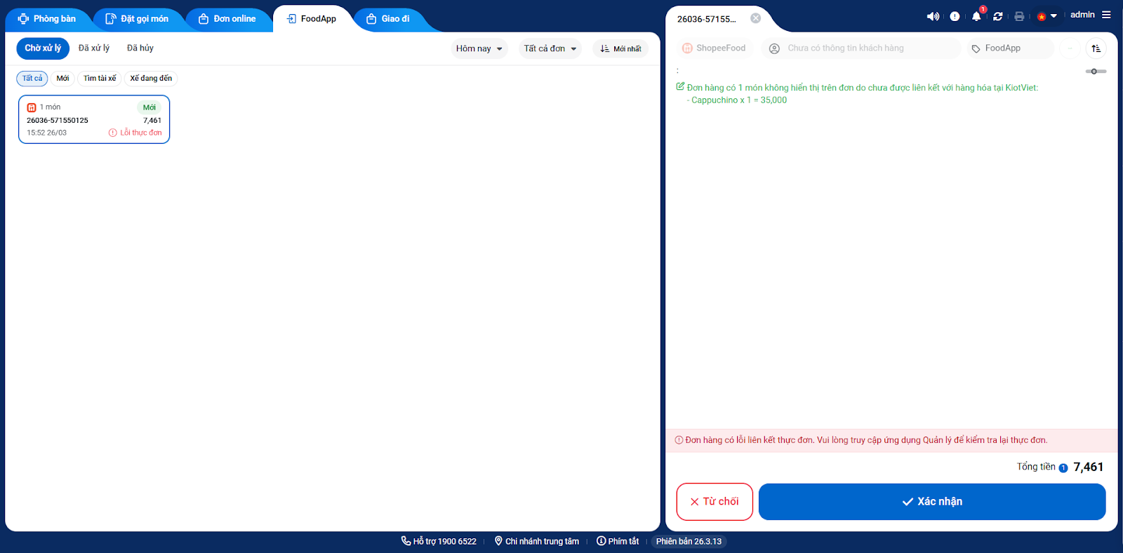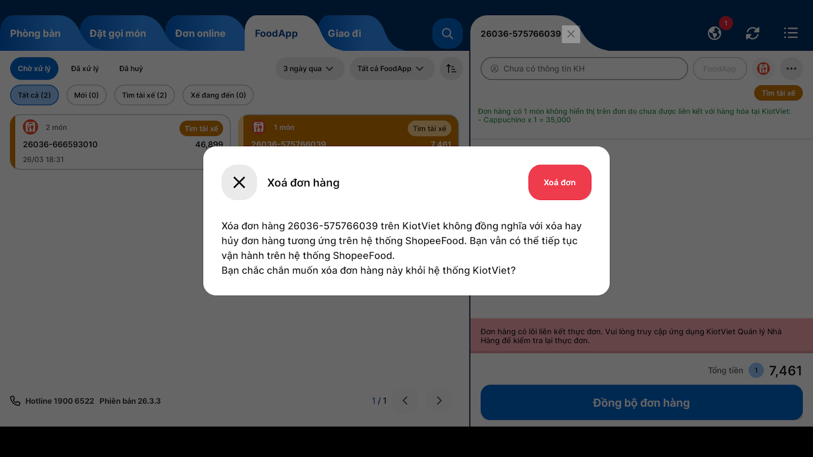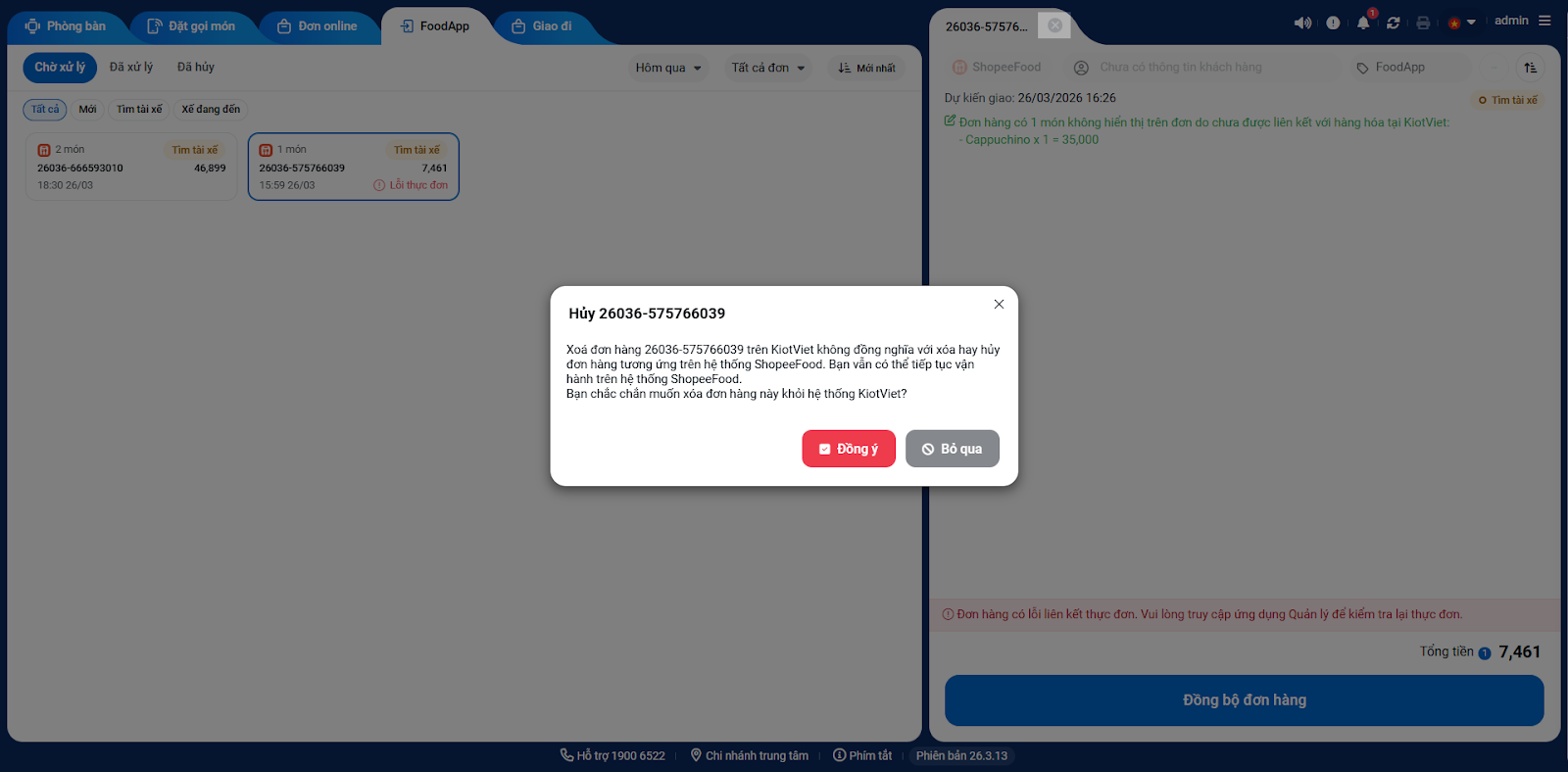 Lưu ý: Đơn lỗi liên kết món sẽ không tự động hoàn thành, gian hàng thao tác xóa đơn lỗi (điều kiện: đơn về KiotViet sau 24h, tài khoản có quyền Xóa hóa đơn và chưa được tạo hóa đơn trên KiotViet) hoặc nhấn Hoàn thành (sau khi đã đồng bộ đơn hàng) để đơn không bị treo trên màn hình Thu ngân.