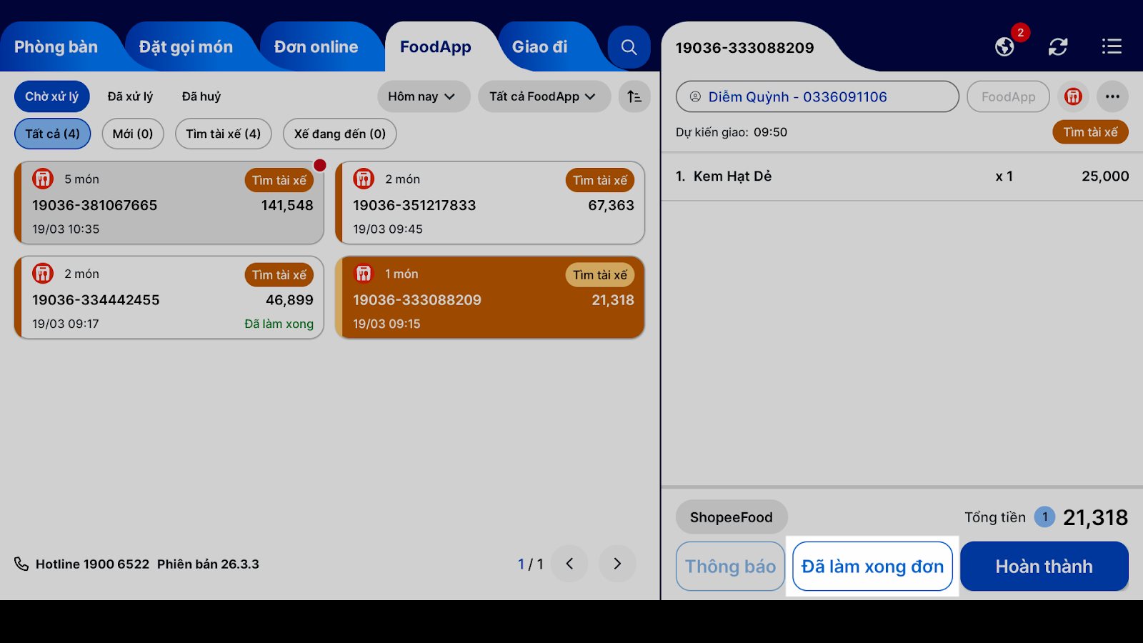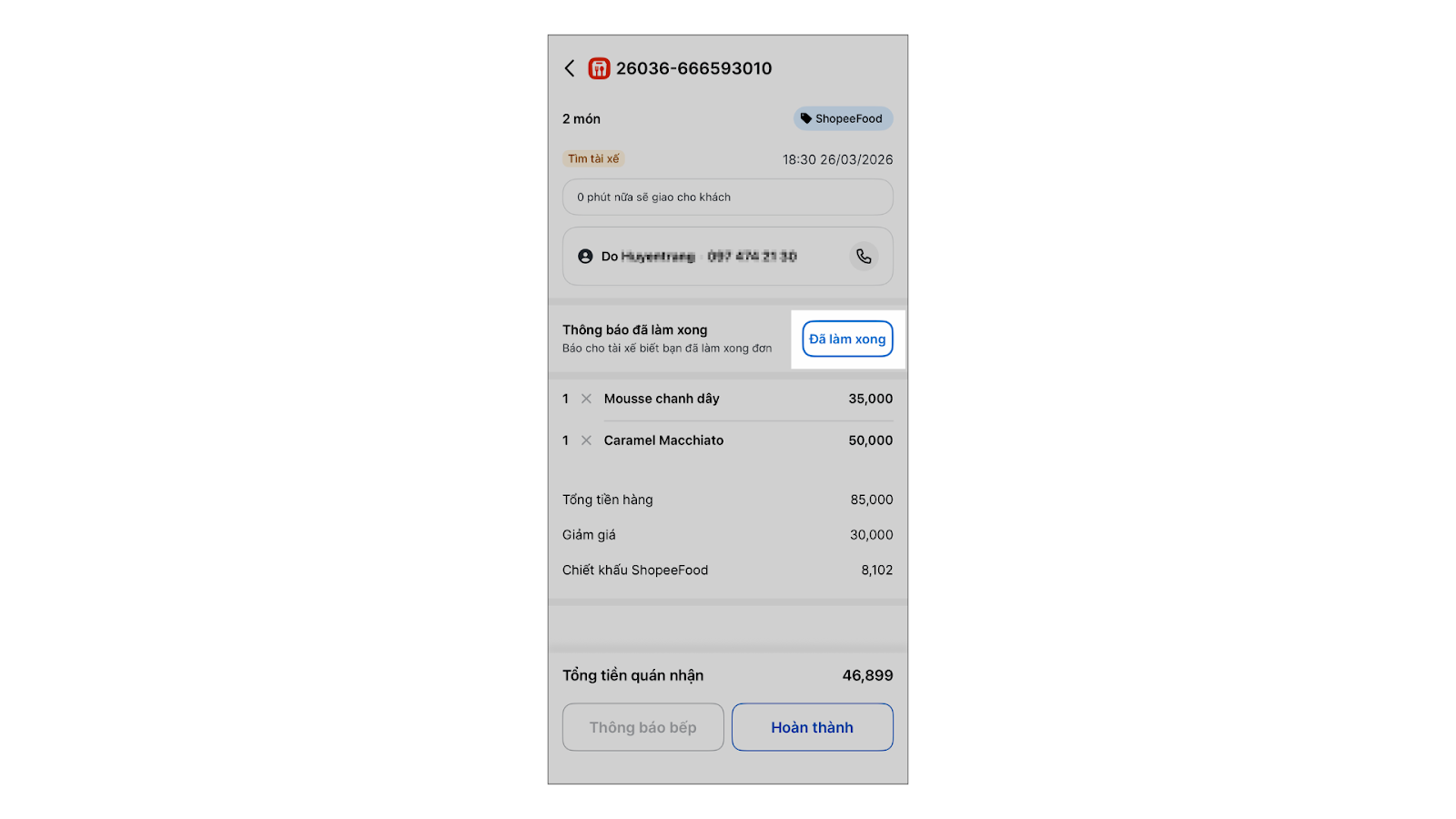 - Bước 4 – Gửi thông báo đến tài xế: Ngay khi đóng gói đơn hàng xong, bạn nhấn Đã làm xong đơn để thông báo cho tài xế biết đơn đã hoàn tất, có thể đến lấy hàng và ghi nhận thời gian thực tế hoàn thành đơn nhằm đối soát với thời gian quy định (tương tự như chức năng Thông báo Tài xế trên ShopeeFood).