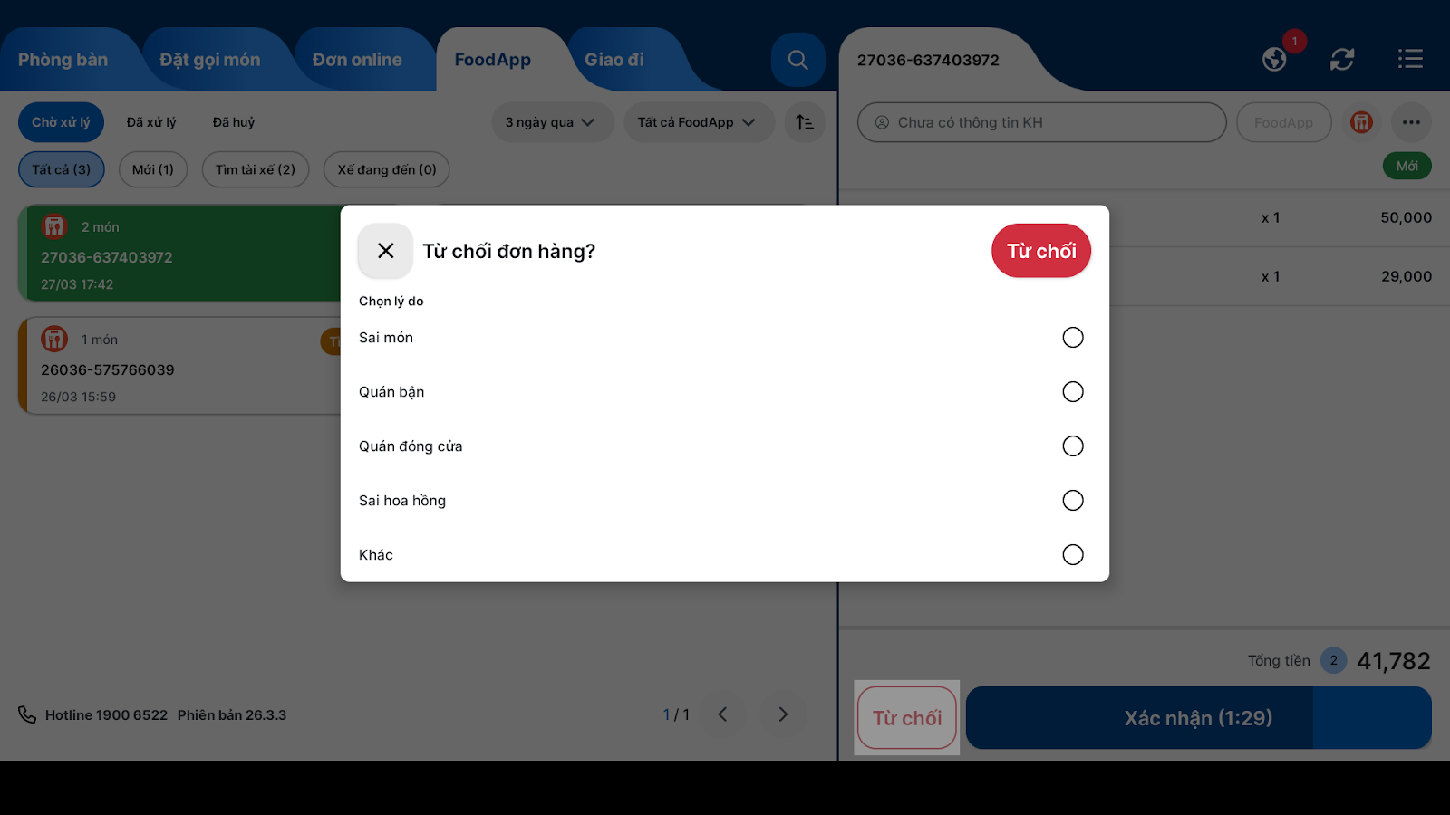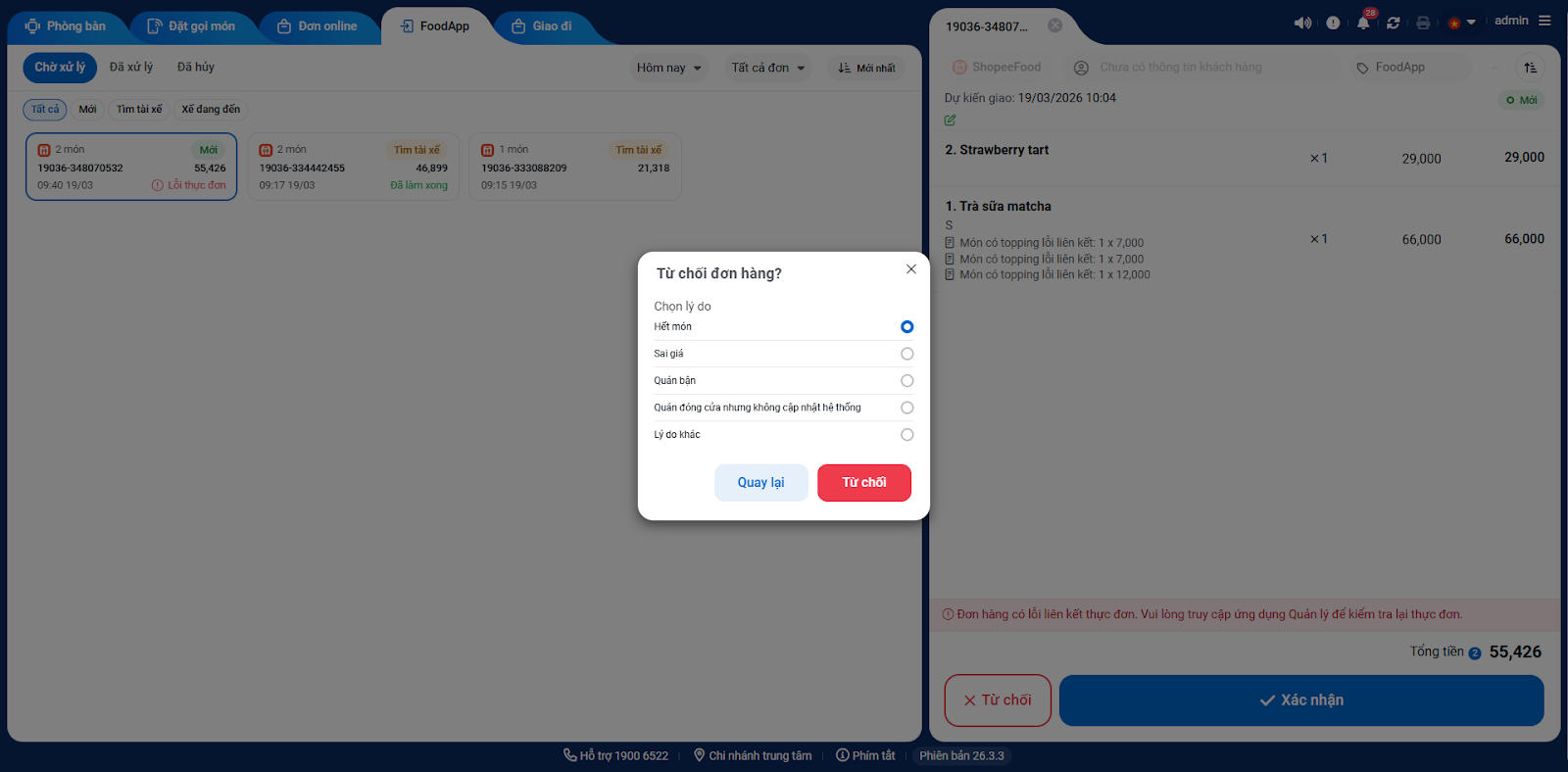 - Nếu nhấn Từ chối: Bạn chọn lý do từ chối đơn hàng → tiếp tục nhấn Từ chối → đơn hàng chuyển trạng thái thành Đã hủy và đồng bộ trạng thái tương ứng trên ShopeeFood.