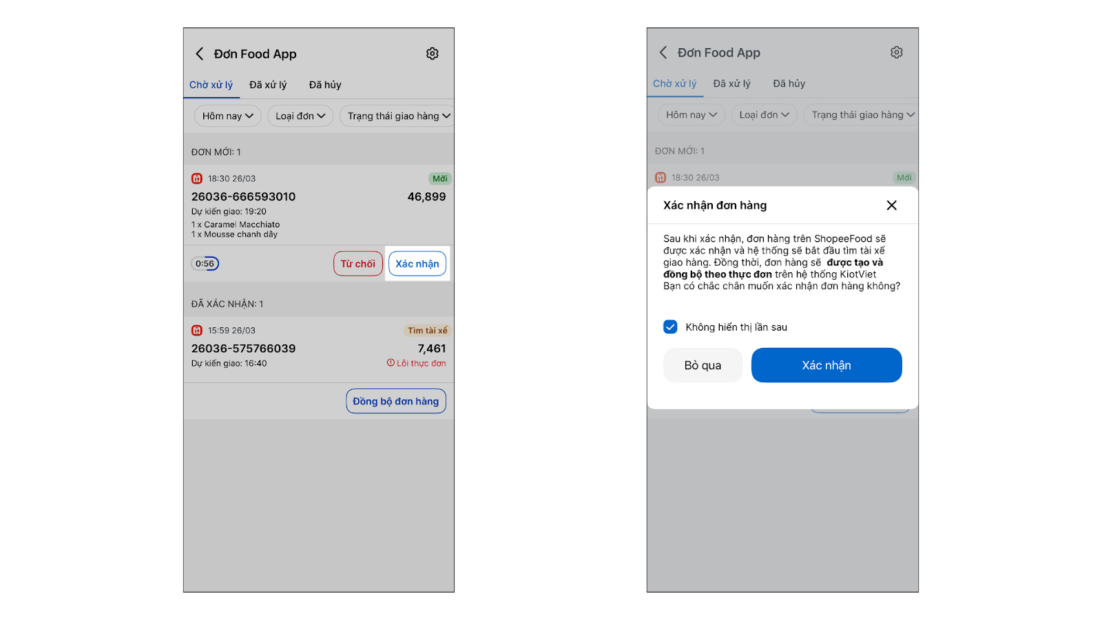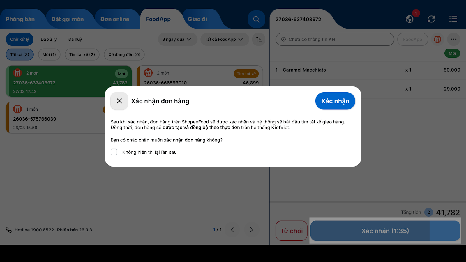 - Nếu bạn chọn Xác nhận: Hệ thống hiển thị pop-up thông báo → tiếp tục nhấn Xác nhận → đơn hàng trên ShopeeFood sẽ được xác nhận và hệ thống bắt đầu tìm tài xế giao hàng. Đồng thời, đơn hàng sẽ được tạo và đồng bộ theo thực đơn trên hệ thống KiotViet.