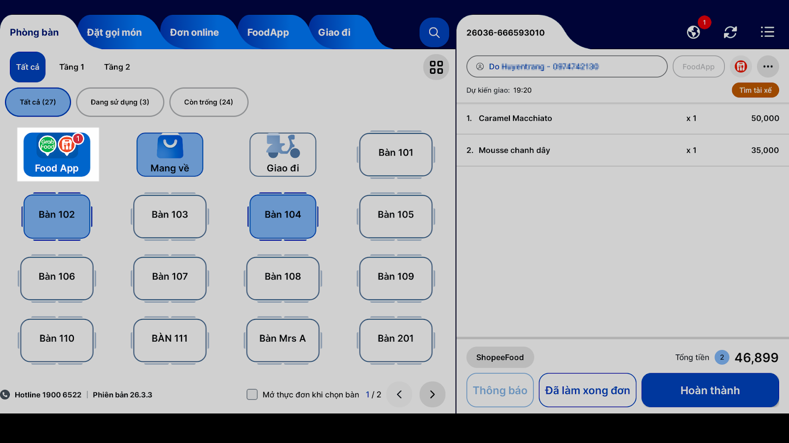 - Tùy theo quy trình vận hành thực tế của quán, sau khi đơn được xác nhận, bạn thực hiện thao tác Thông báo, in bếp như đơn thông thường.