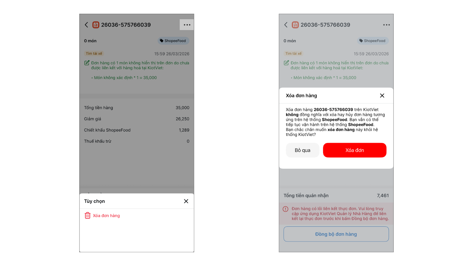 - Thao tác trên đơn hàng: Trên chi tiết đơn hàng, bạn chạm 3 chấm → chọn Xóa đơn hàng → xác nhận Xóa đơn.
