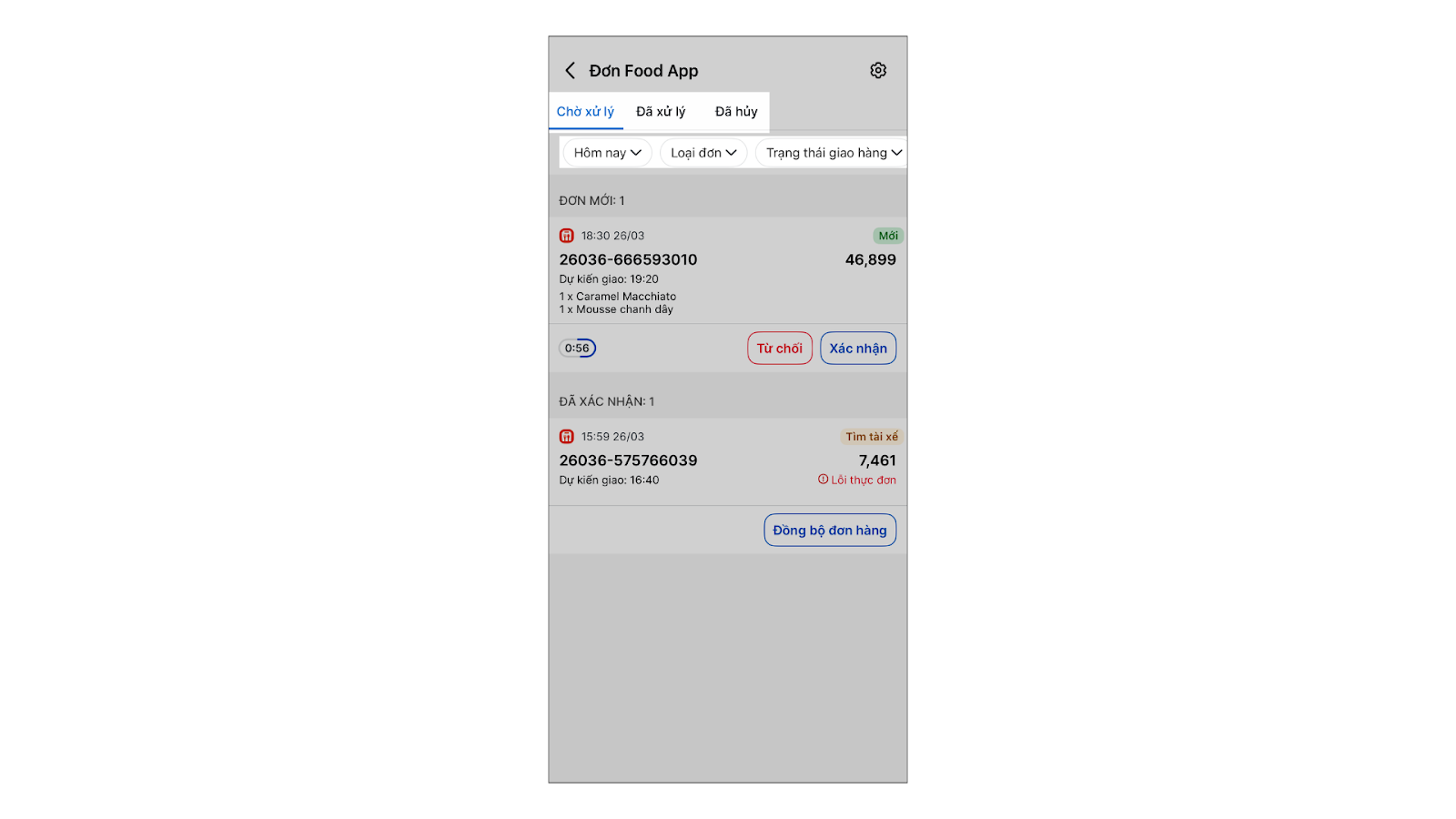 - Bước 4: Theo dõi đơn hàng. Màn hình Food App được chia thành 3 tab: Chờ Xử lý, Đã xử lý, Đã hủy kèm theo các bộ lọc: Thời gian, Loại đơn, Trạng thái giao hàng để nhân viên dễ quản lý trạng thái đơn hàng.