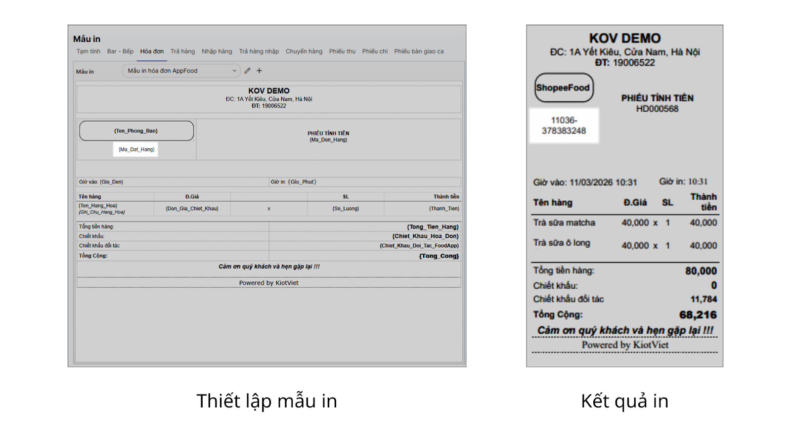 - {Ma_Dat_Hang}: Mã đơn hàng ShopeeFood ở mẫu in hóa đơn.