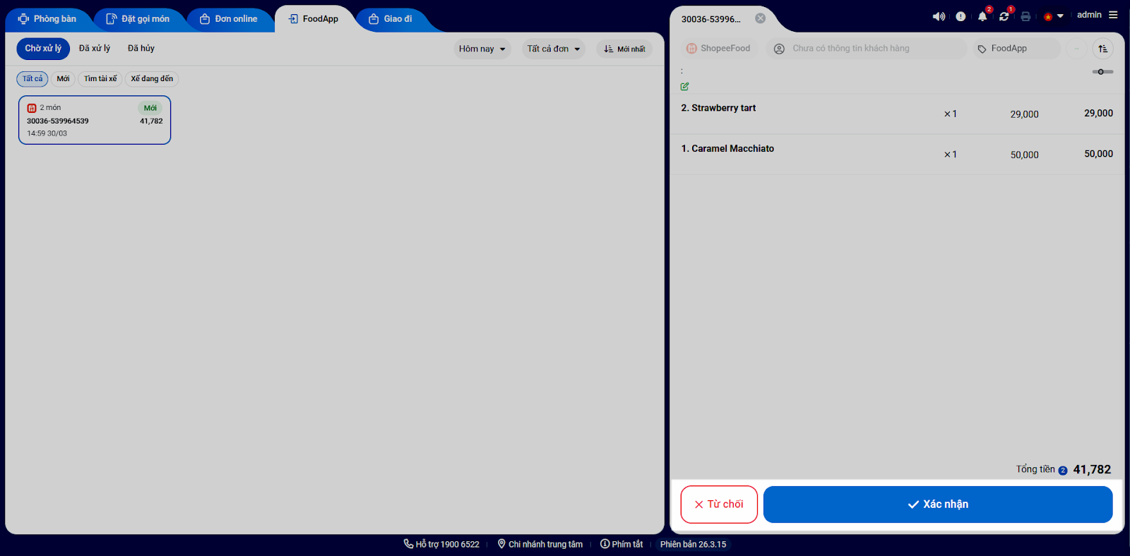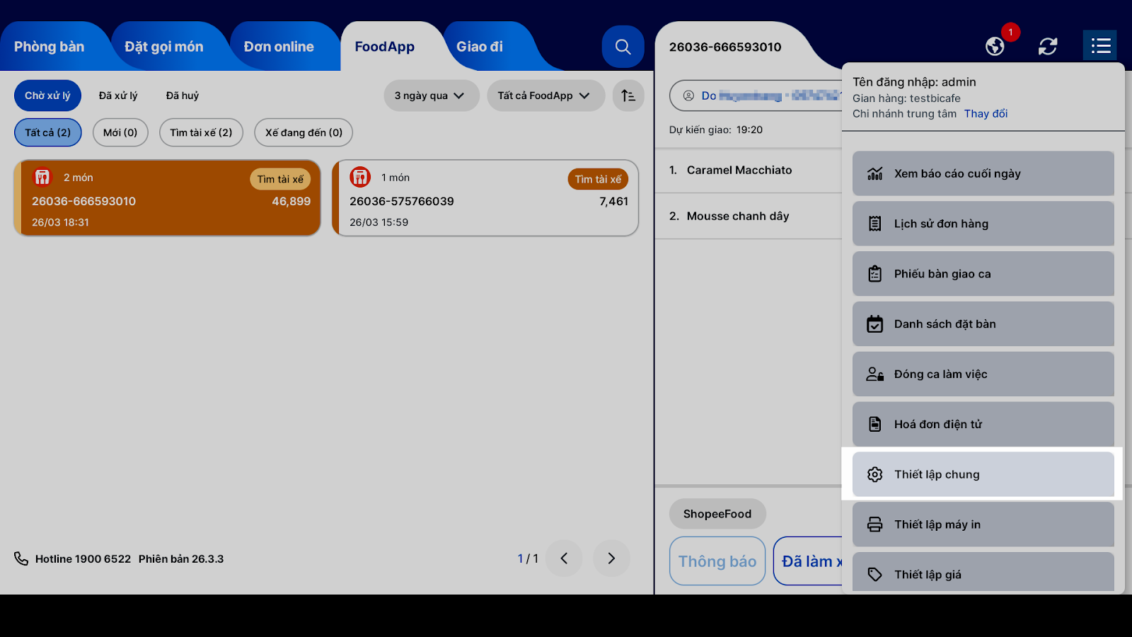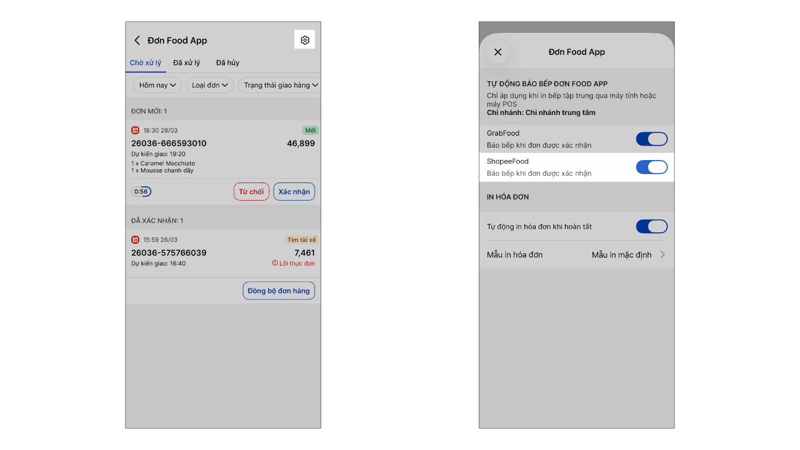 Tình huống: Thu ngân thực hiện tiếp nhận, xử lý và theo dõi đơn hàng ShopeeFood trực tiếp trên máy POS.