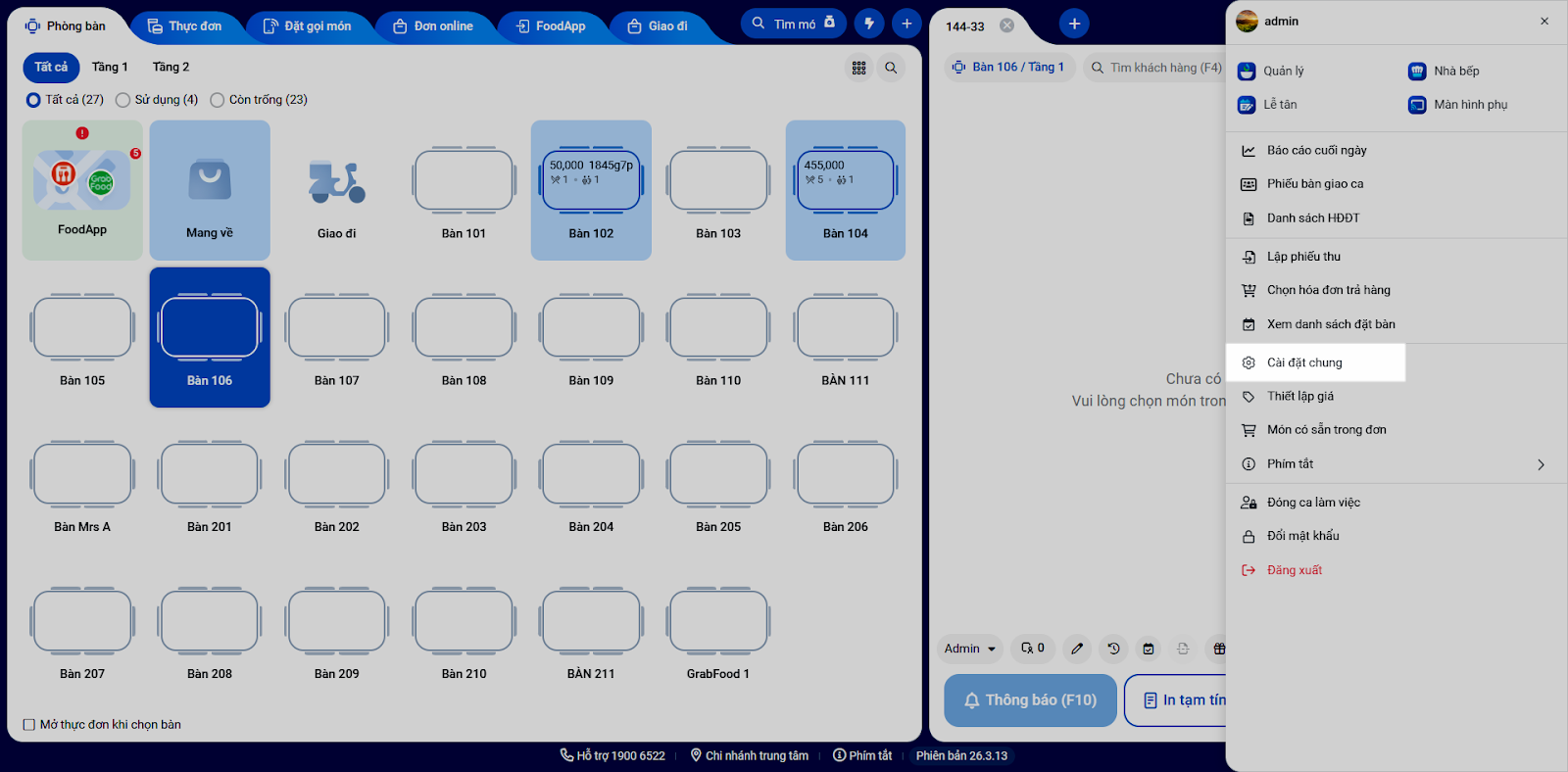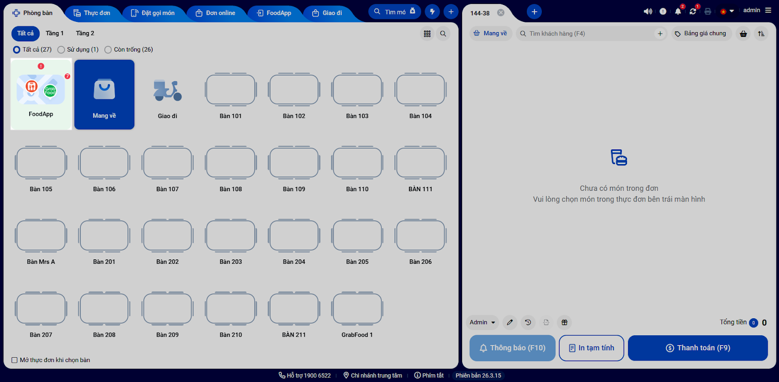 - Bước 1 – Tiếp nhận đơn hàng: Khi có đơn hàng mới, hệ thống sẽ gửi thông báo và kèm theo âm thanh để nhân viên nhận biết và hiển thị số lượng đơn ở tab Phòng bàn. Bạn kích vào bàn FoodApp hoặc chọn tab FoodApp để xem danh sách đơn hàng.