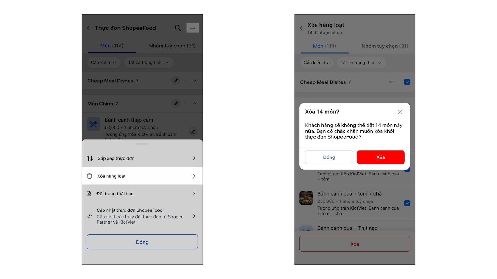 - Tích chọn món/ tùy chọn → chạm Xóa → xác nhận Xóa.