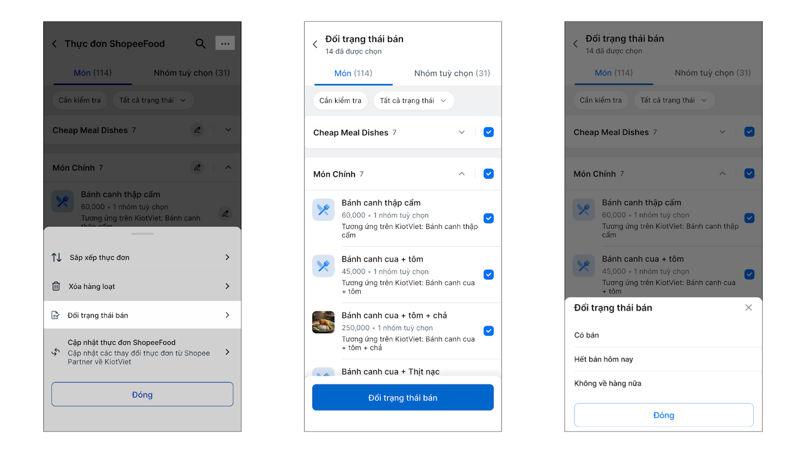 - Tích chọn món/ tùy chọn → chạm Đổi trạng thái bán.