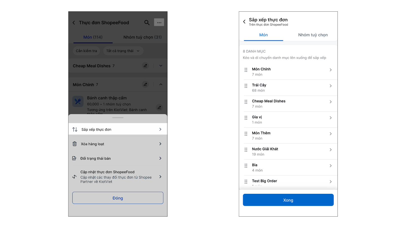 - Kéo và di chuyển danh mục/ nhóm tùy chọn hoặc chọn và danh mục/ nhóm tùy chọn cụ thể để kéo và di chuyển món/ tùy chọn lên xuống sắp xếp theo vị trí mong muốn → chạm Xong.