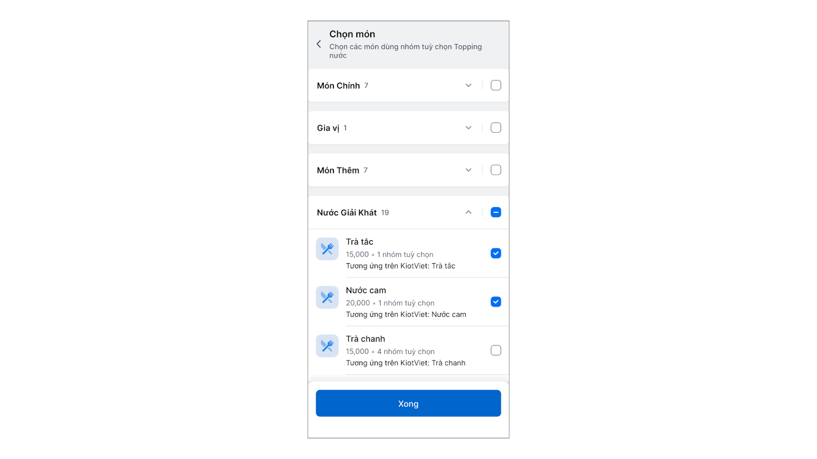 - Chọn món từ danh sách KiotViet (hỗ trợ món thường, món có thuộc tính, món thêm, combo cố định).