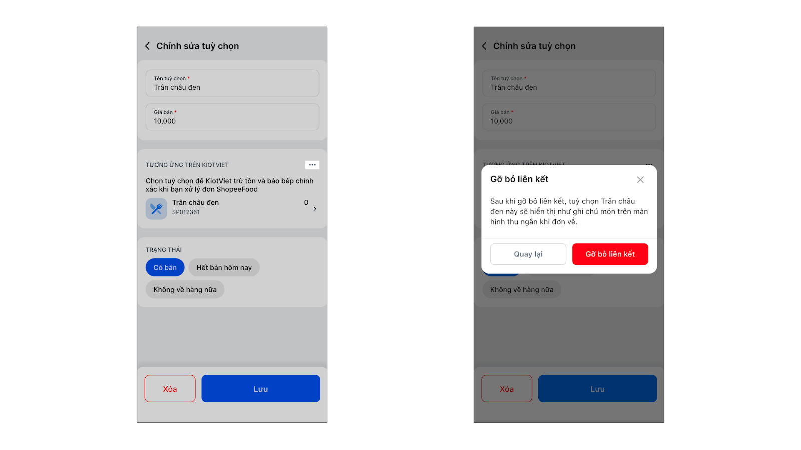 - Khi chỉnh sửa thông tin tùy chọn, bạn có thể gỡ bỏ liên kết với hàng hóa tương ứng trên KiotViet bằng cách chạm vào biểu tượng 3 chấm → chọn Gỡ bỏ liên kết.