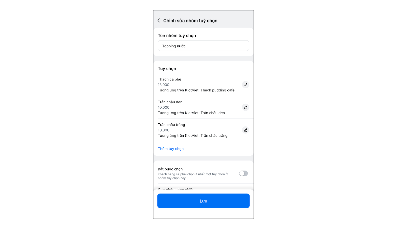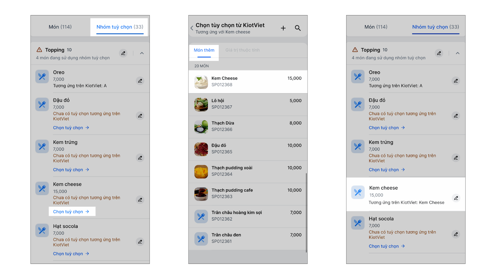 - Liên kết với Món thêm (Topping): Áp dụng khi tùy chọn là topping hoặc món thêm của món chính. Ví dụ: Trân châu, Thạch, Pudding, Kem cheese…