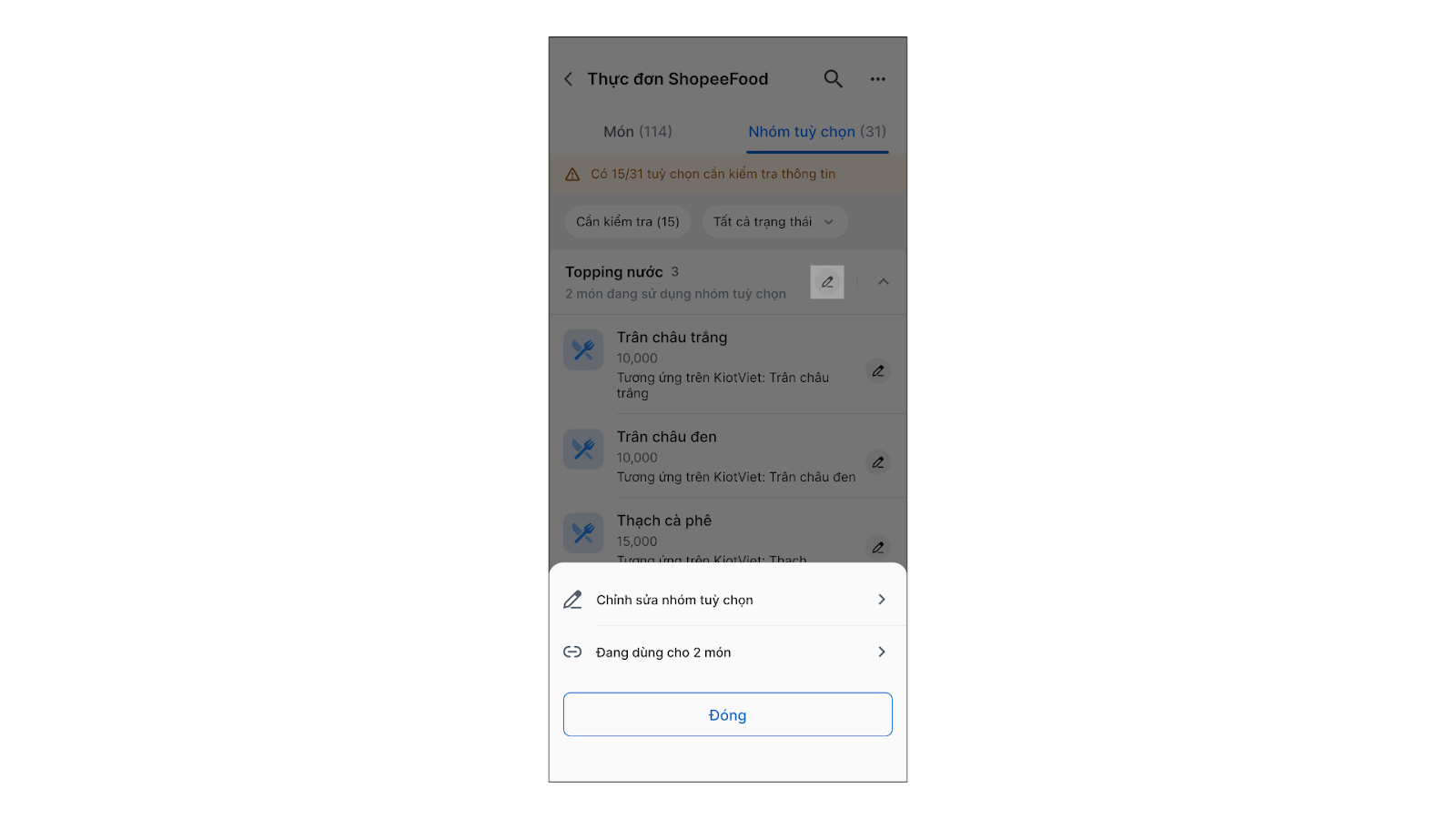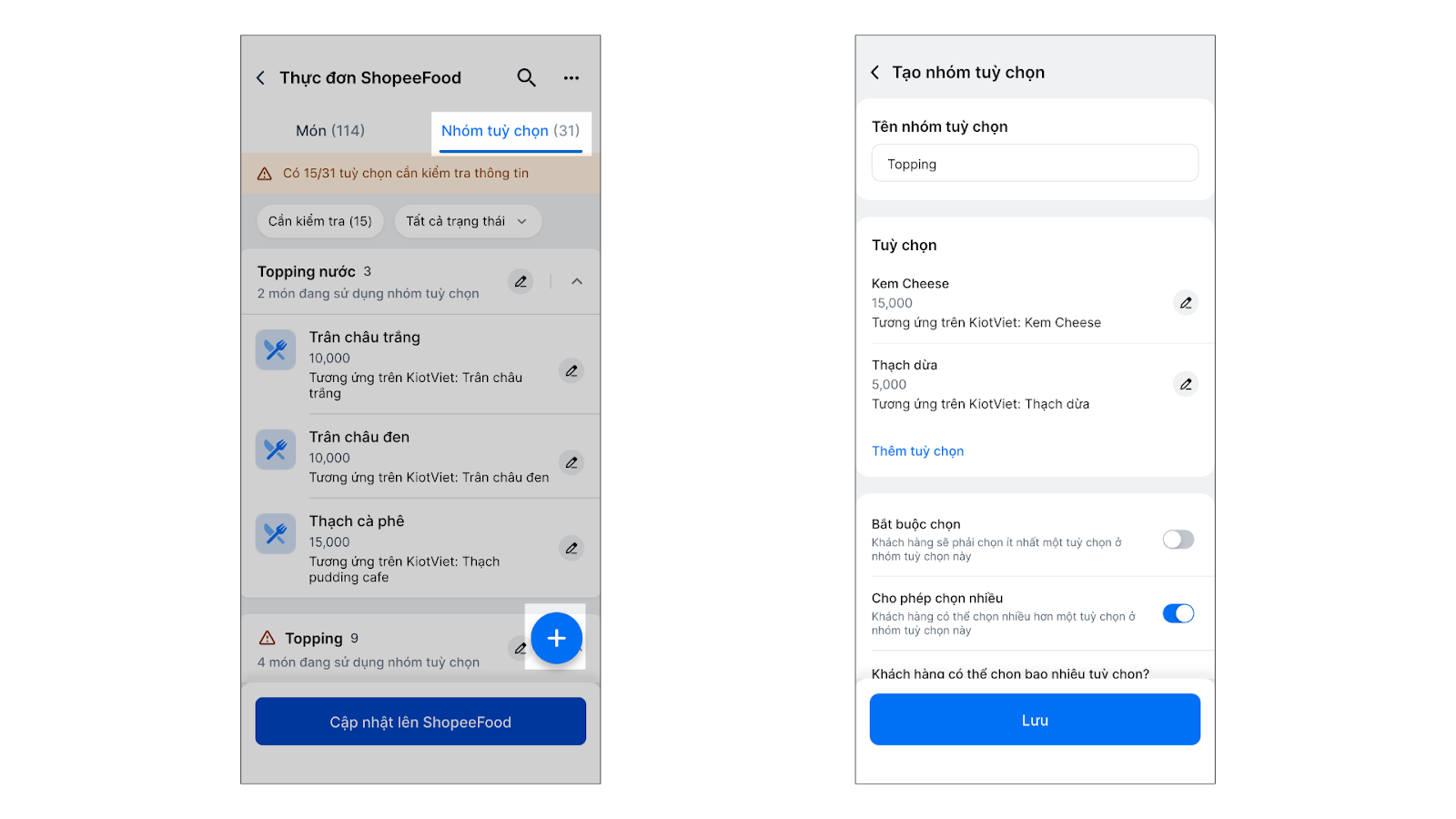 - Tùy chọn ShopeeFood có thể liên kết với: Món thêm hoặc Giá trị thuộc tính của món KiotViet.