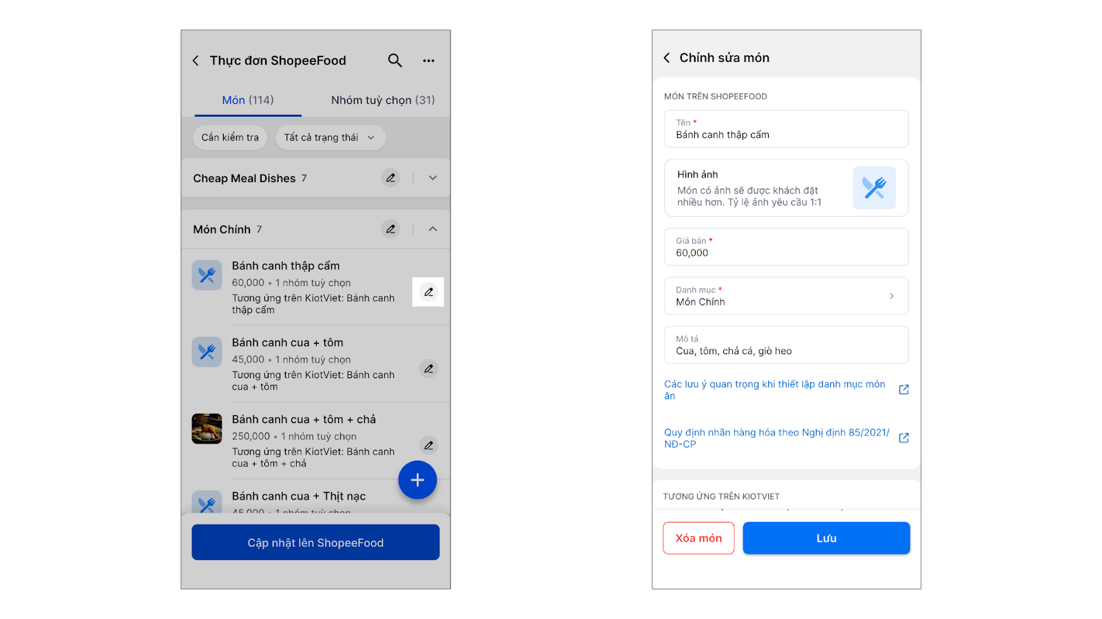 - Món ShopeeFood có thể được liên kết với: Món chính hoặc Món thêm trên KiotViet.