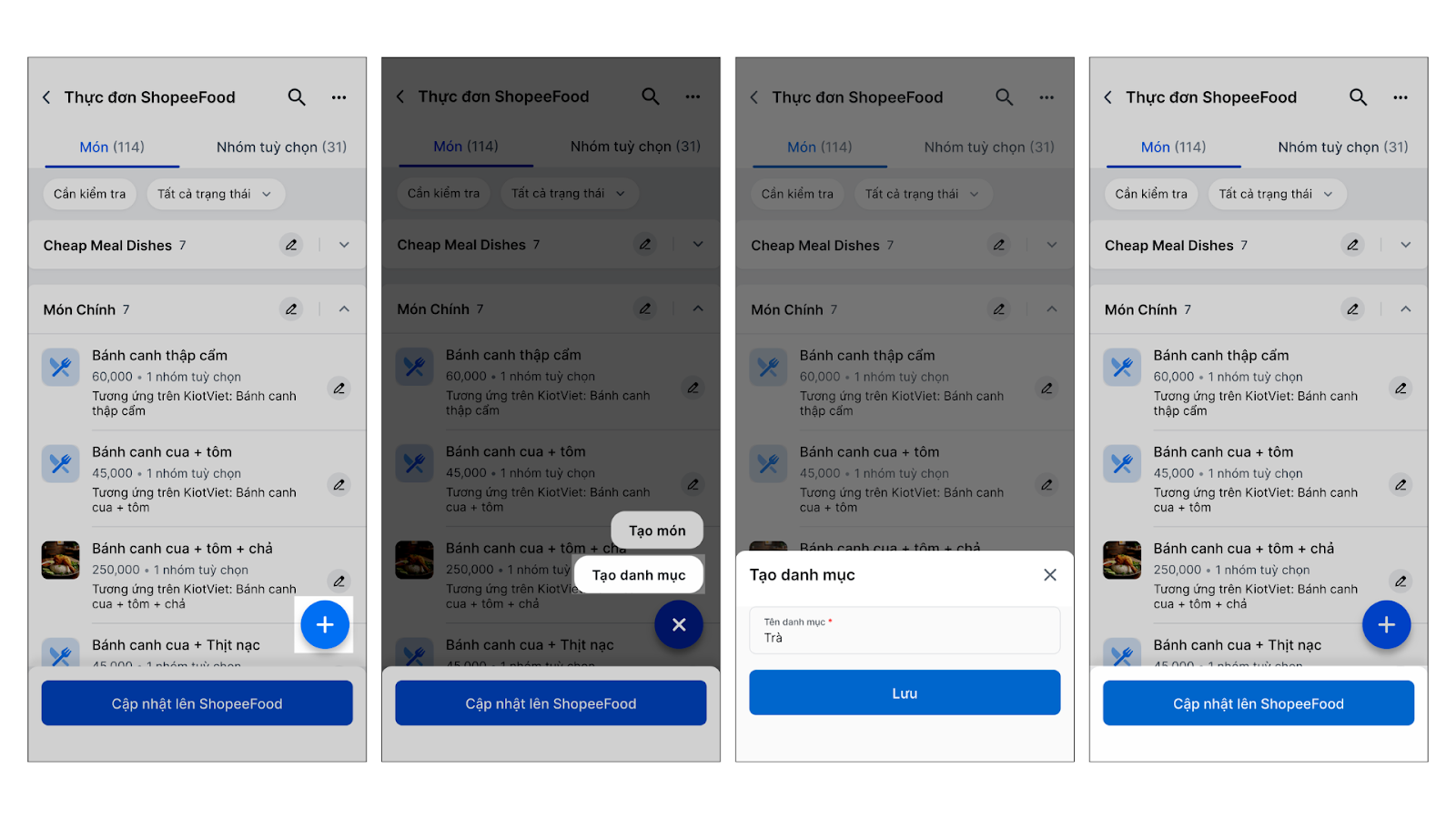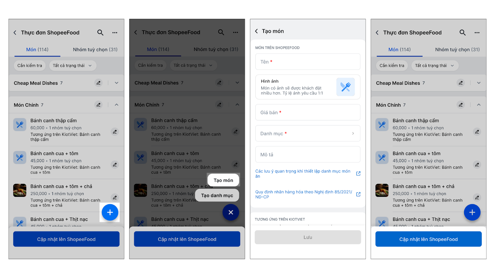 - Hệ thống sẽ tự động điền thông tin từ ShopeeFood (Tên, Giá, Mô tả).