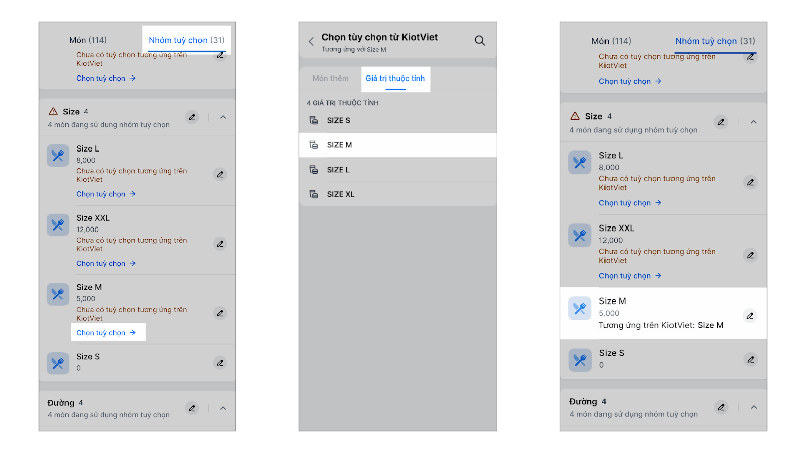 - Liên kết với Giá trị thuộc tính (Size/Kích thước): Áp dụng khi tùy chọn là thuộc tính của món chính. Ví dụ: Size, Kích thước.