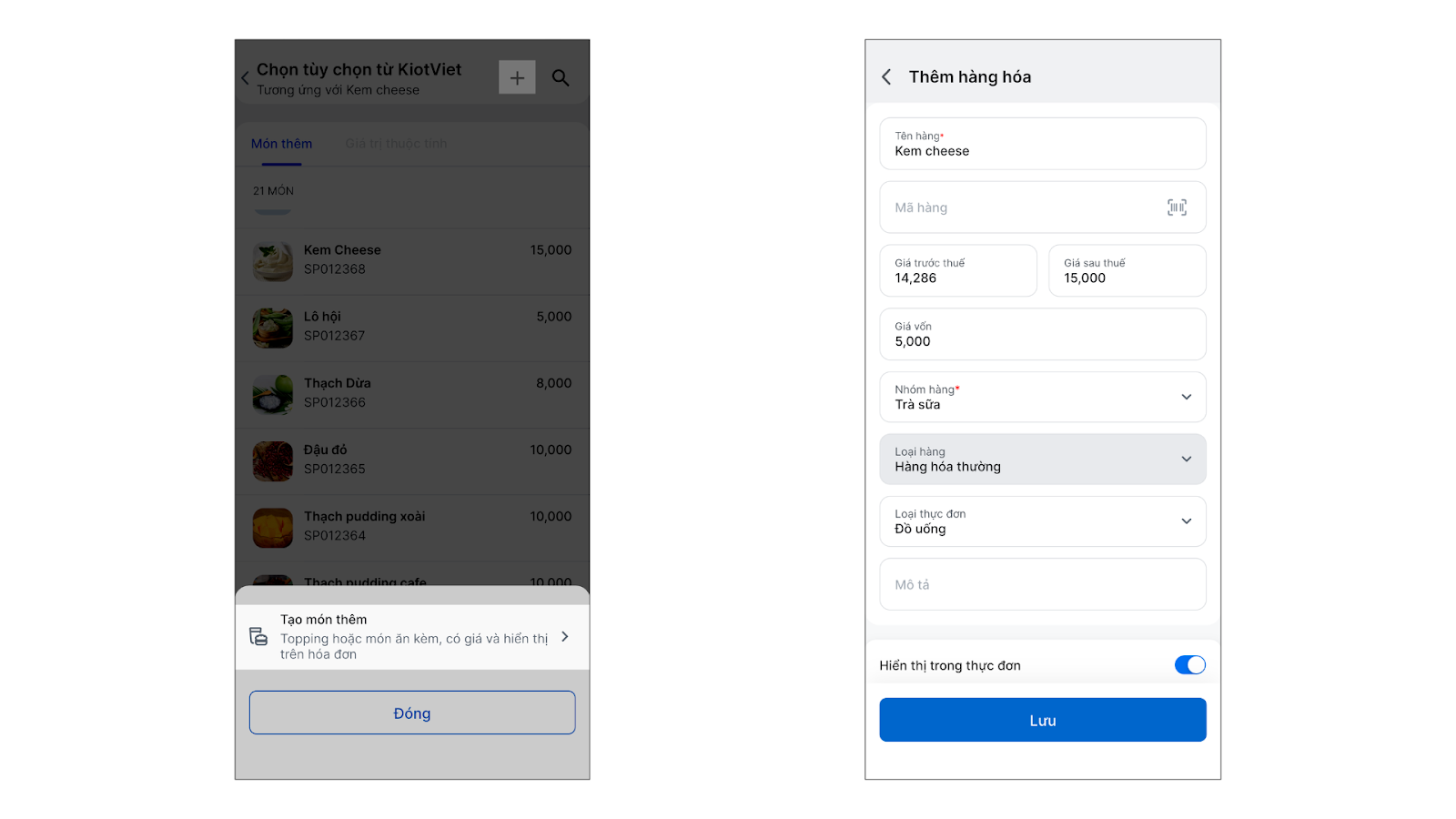 - Nếu chưa có, bạn có thể chọn tạo món thêm ngay tại đây bằng cách chạm vào dấu + → chọn Tạo món thêm → ghi nhận thông tin → chạm Lưu.