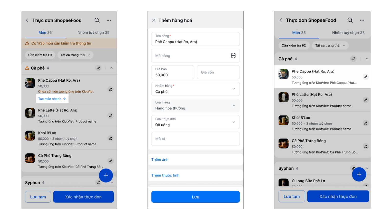 - Đồng bộ thực đơn thông minh: Hệ thống hỗ trợ tự động liên kết món ăn trên ShopeeFood với hàng hóa trên KiotViet, giúp giảm thiểu tối đa thao tác ghép nối thủ công.