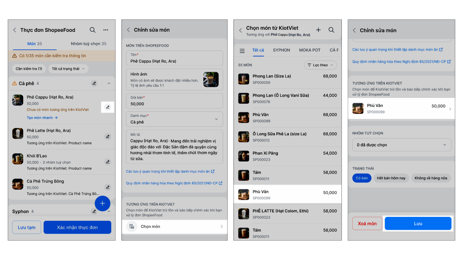 Tình huống: Hệ thống tự động ghép nối các món ăn giữa ShopeeFood và KiotViet, bạn chỉ cần kiểm tra lại các món chưa khớp.