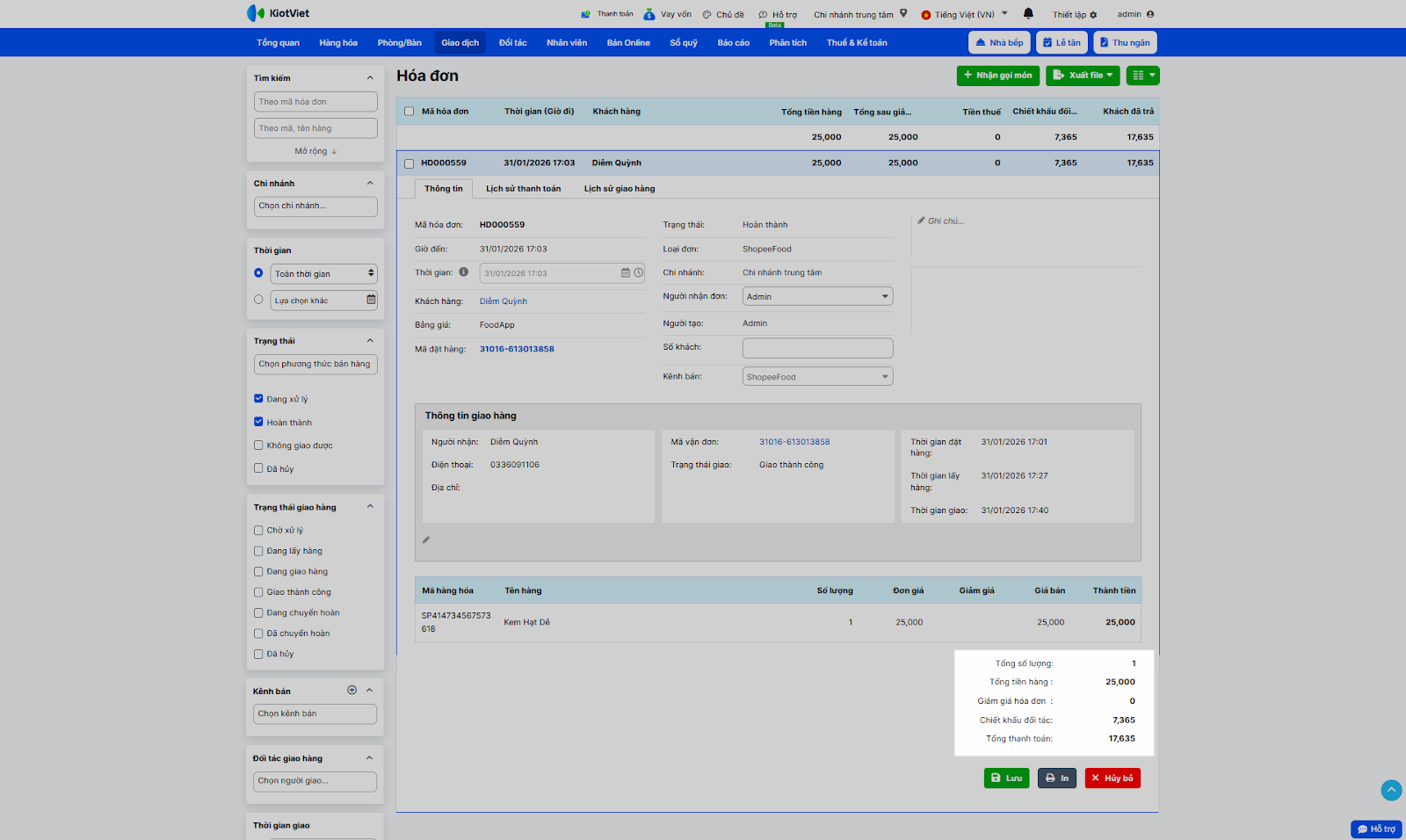 - Bước 6 – Tự động hoàn thành: Với đơn không bị lỗi liên kết, khi đơn hàng chuyển sang trạng thái Đã giao trên ShopeeFood, hệ thống sẽ tự động hoàn thành đơn hàng và tạo hóa đơn tương ứng trên KiotViet. Doanh thu đơn hàng ShopeeFood được ghi nhận bằng Tổng tiền quán nhận từ ShopeeFood sau khi trừ Chiết khấu đối tác.