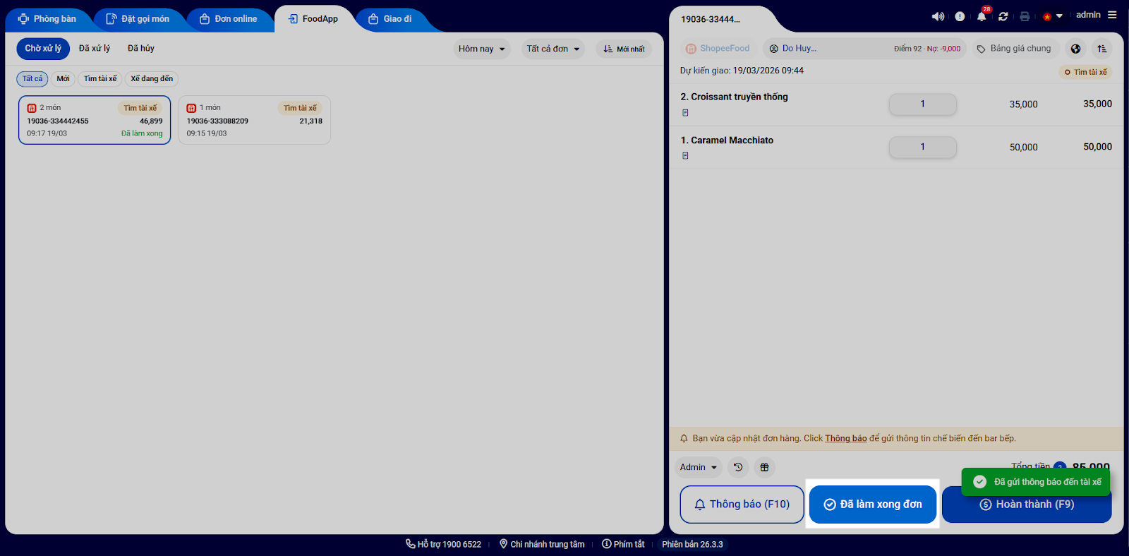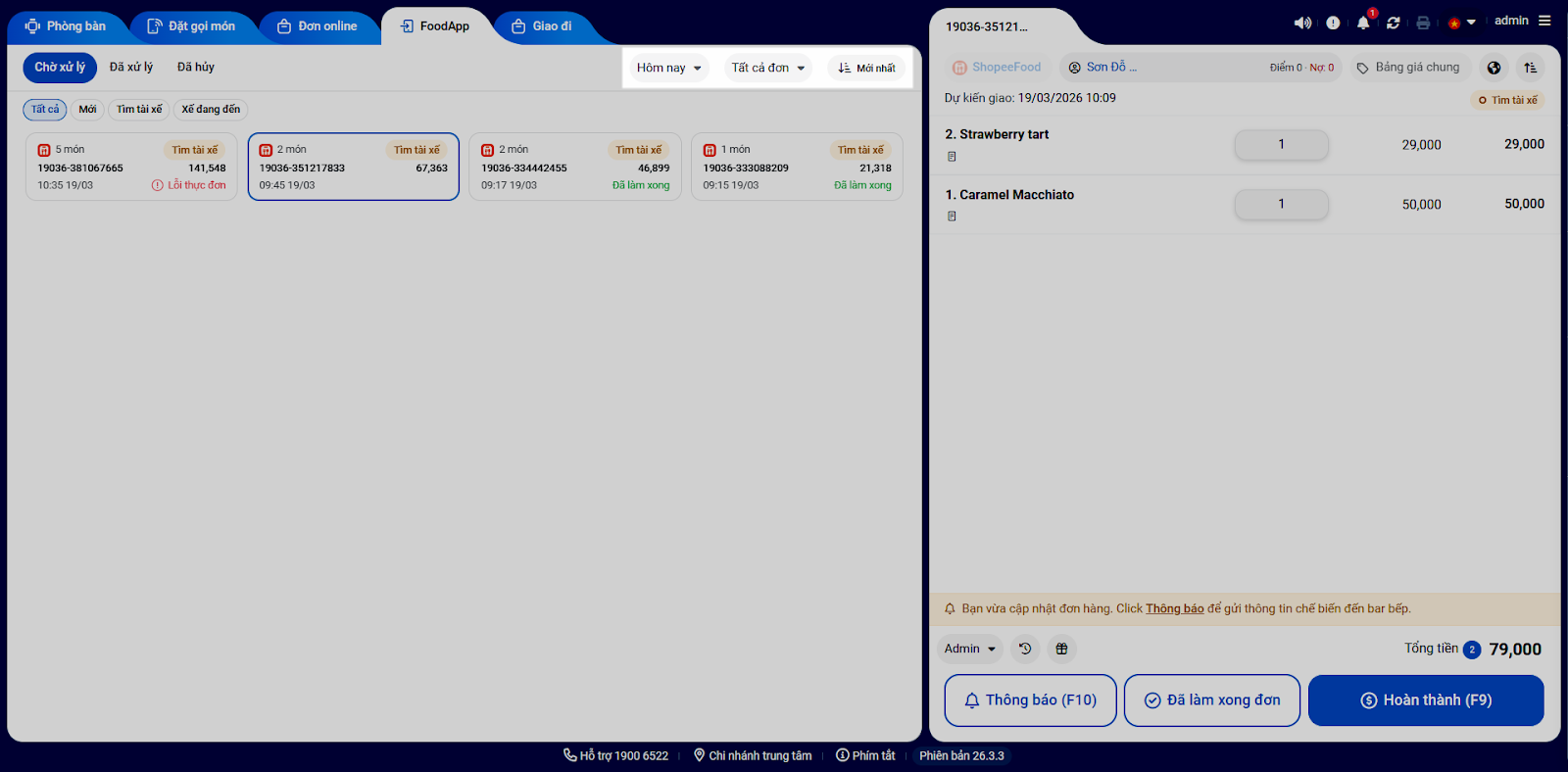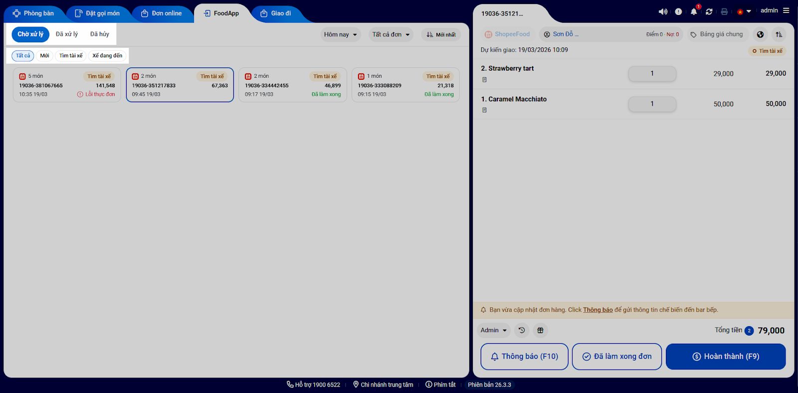 Tình huống: Khi có khách đặt món trên ứng dụng ShopeeFood, quán nhận đơn, tiến hành theo dõi và xử lý giao đồ cho tài xế trên máy tính (màn hình Thu ngân).