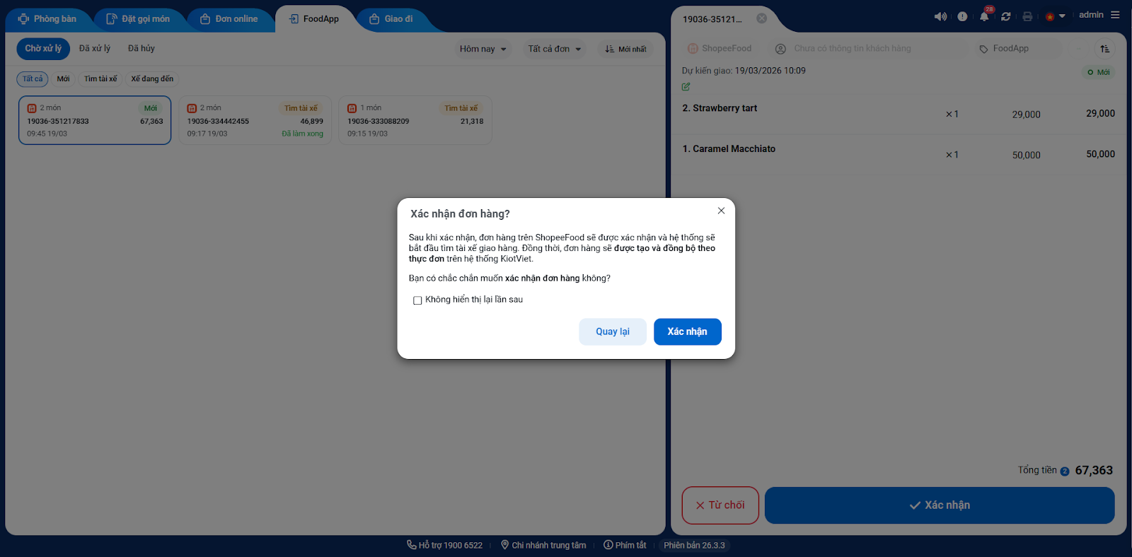 Lưu ý: Bạn có thể tích Không hiển thị lại lần sau trên pop-up thông báo nếu chỉ cần nhấn 1 lần Xác nhận cho các đơn hàng tiếp theo.