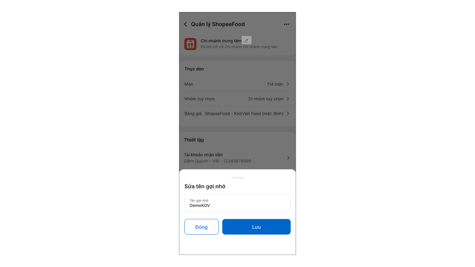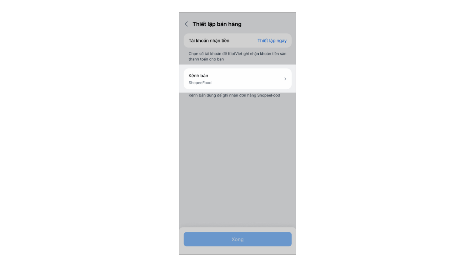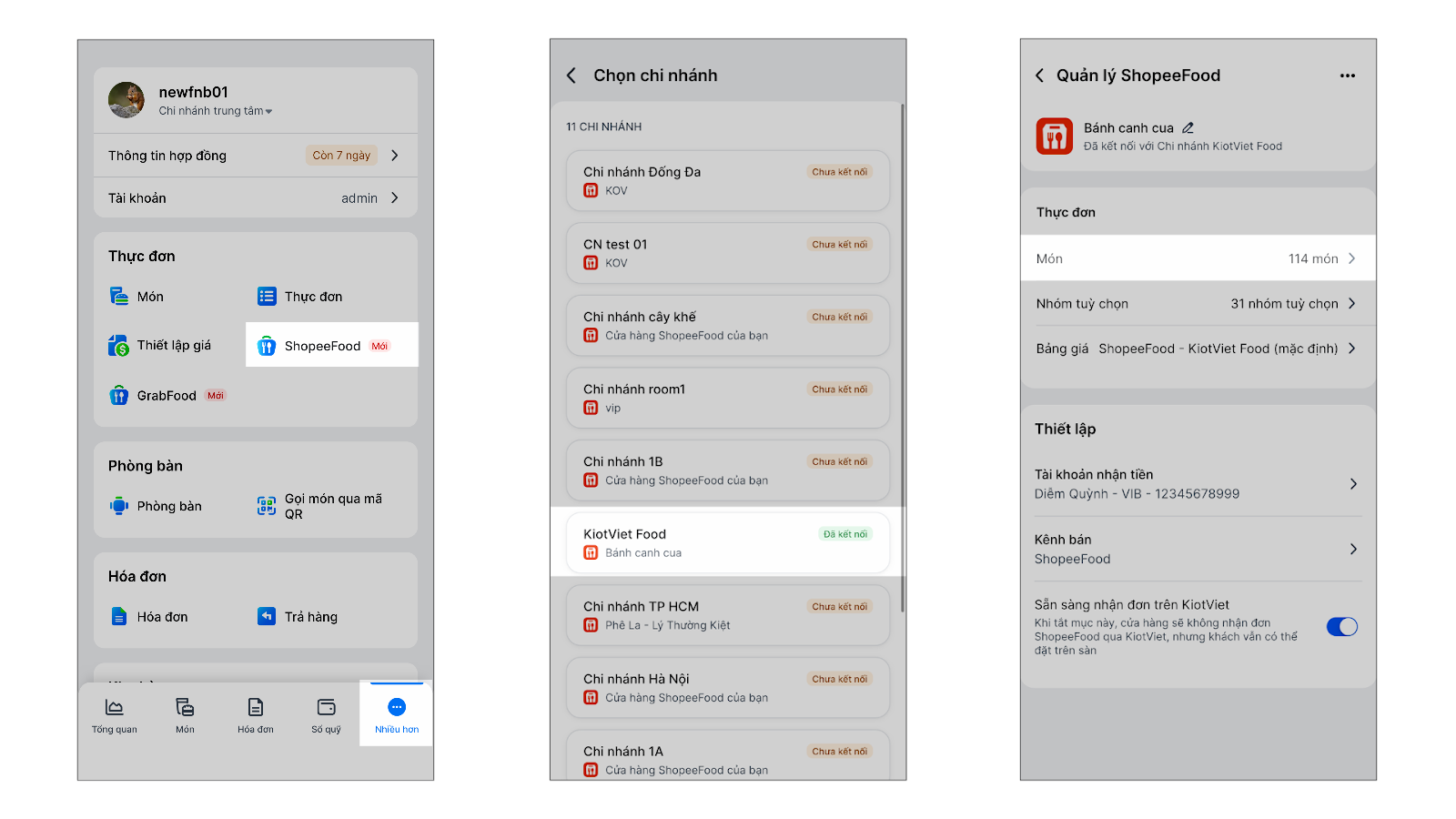 Tình huống: Sau khi hoàn tất liên kết thực đơn, bạn tiến hành thiết lập vận hành để đảm bảo các đơn hàng từ ShopeeFood khi về KiotViet sẽ được ghi nhận đúng kênh bán, tiền thanh toán được ghi nhận vào đúng tài khoản nhận tiền.